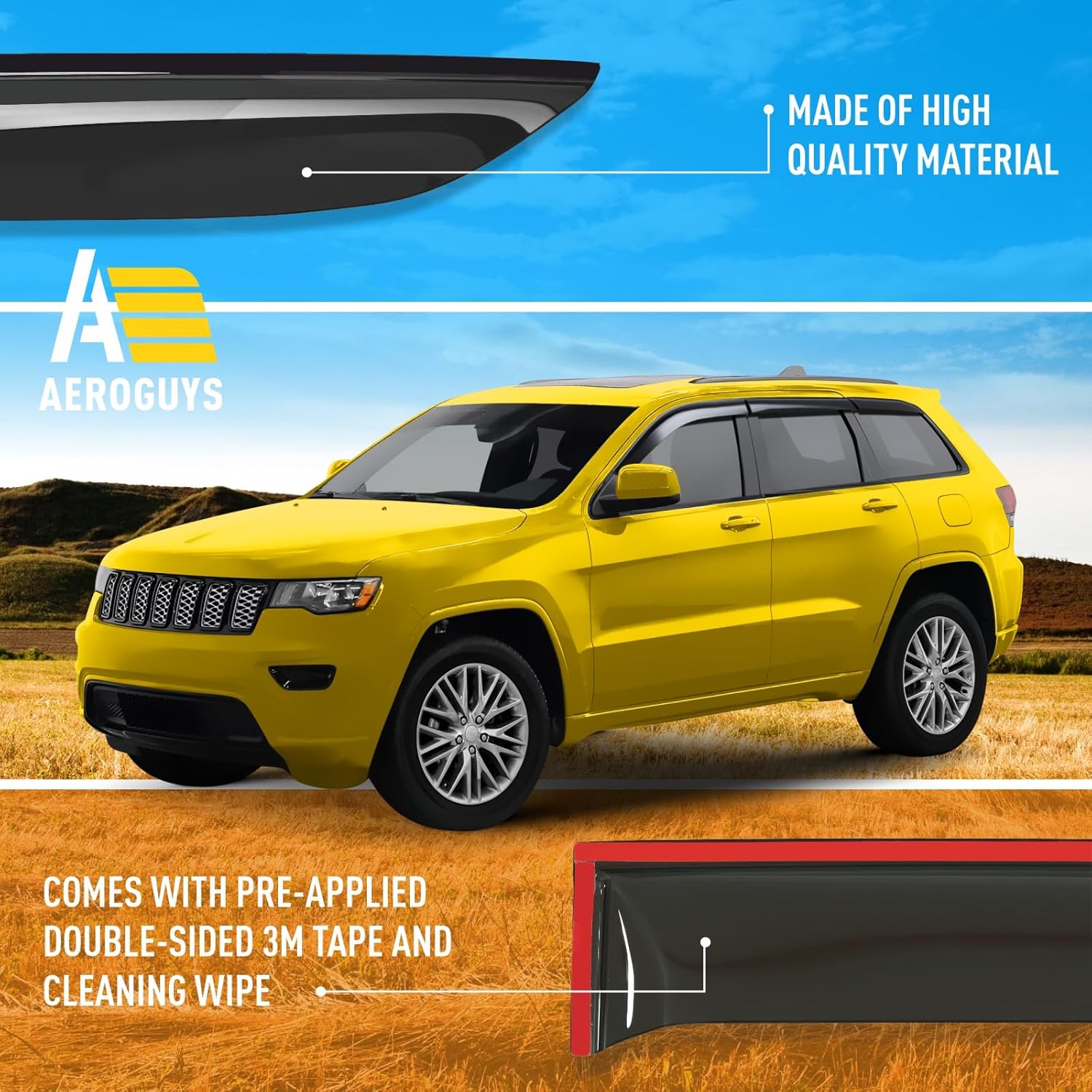 - Incredibly Durable AEROGUYS Auto Window Deflectors – They are made with strong and tough polycarbonate which is clear and scratch-resistant. They also provide UV protection making your ride more comfortable under all weather conditions.