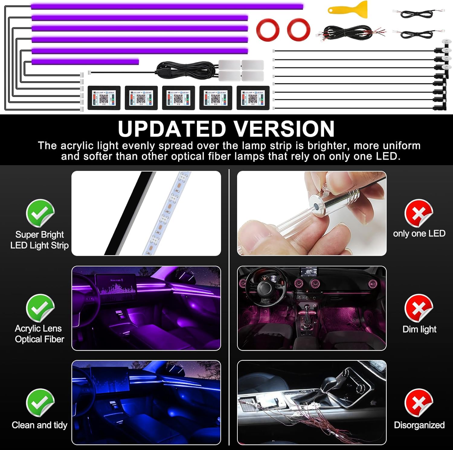 Acrylic Interior Car LED Strip Light with Wireless APP, Car Accessories 18 in 1 with 175 inches 593 LEDs Fiber Optic Ambient Lighting Kits, RGB Dynamic Music Sync Neon LED Strip Light for Car