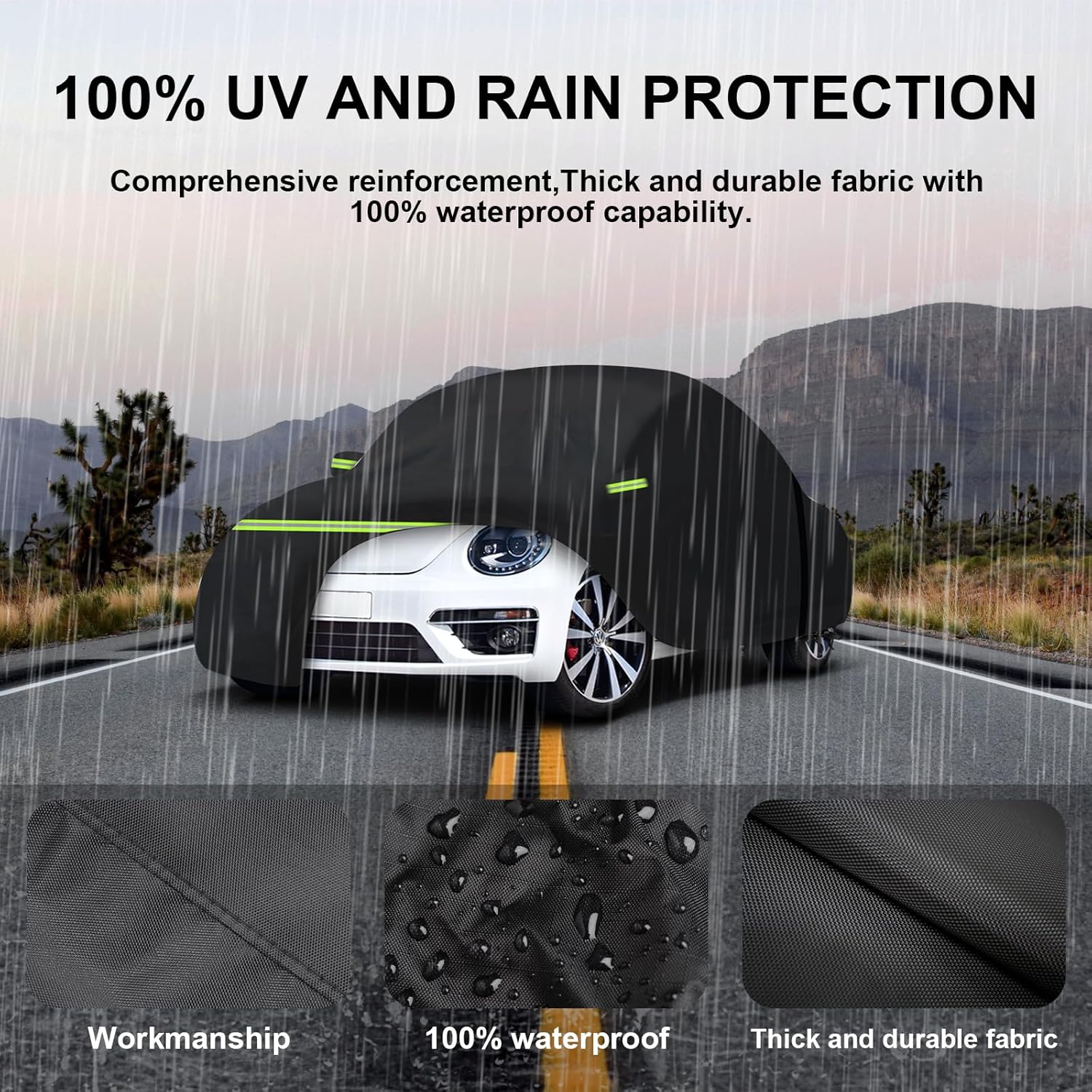 - 【Premium Materials】: 7 layers thickened car cover is made of the latest 100% waterproof heavy duty material. The outermost high-reflective aluminum layer can block 99.95% of ultraviolet rays (UPF 50+).The top fabric is made of aluminum and cotton fleece, which reflects sunlight and keeps your car cooler. The black breathable fabric allows for proper ventilation. the middle layer is upgrade to withstand 2500mm water pressure, and it is 100% waterproof.