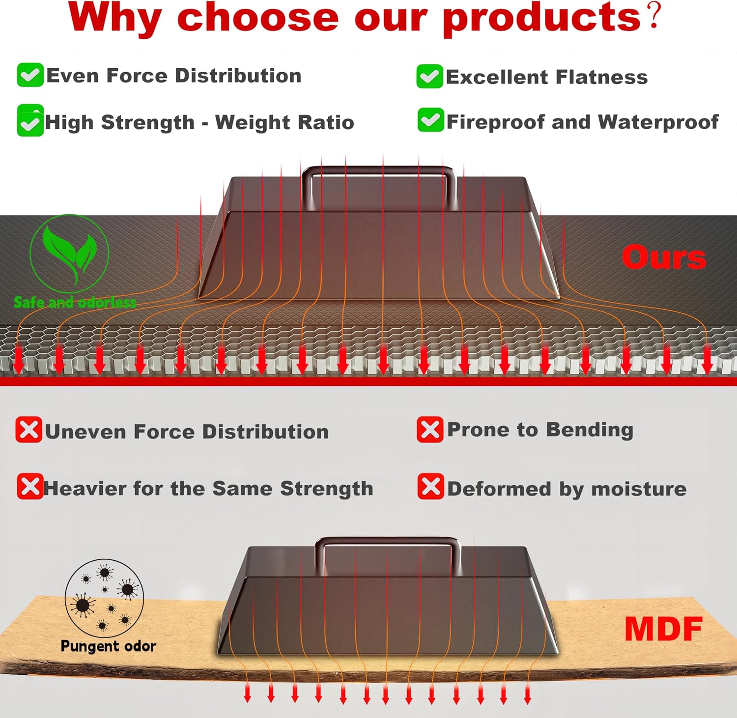 - NOTE: The honeycomb structure has many closed or semi-closed small spaces. When a heavy object is placed on it, the honeycomb's air compression noise indicates even weight distribution – a sign of advanced load-bearing (harmless and temporary)