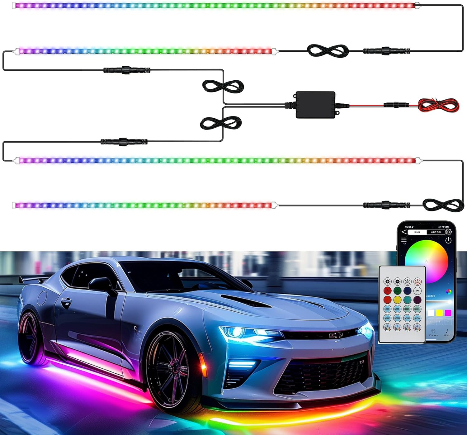 - EASY INSTALLATION & APPLICATION: The under glow car led strip lights with a 2- line design connect the 4 light strips. With strong self-adhesive tape, nylon cable ties clips and screws mounted in any car. Widely used for interior & exterior any 12V automotive cars, trucks, RVs, SUVs, pickup, 4x4 offroad, camper, boat etc