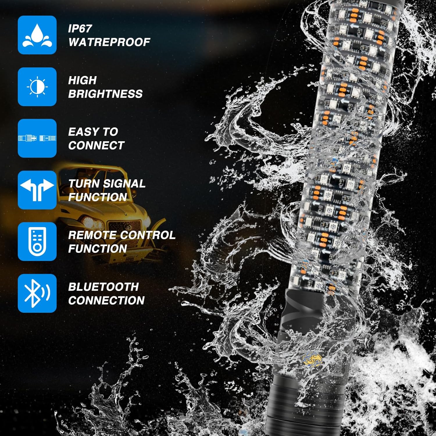 - ăDual Control & Music SynchronizeăDual control by Bluetooth APP and handheld remote with a hook,the ATV whip light can dance to the rhythm of your phone's music and change colors and flash patterns to maximize the thrill of off-roading.Users can personalize their desired combination of lights and easily adjust colors Strobe, color width, direction of motion, brightness, speed and color,bringing more fun to driving.