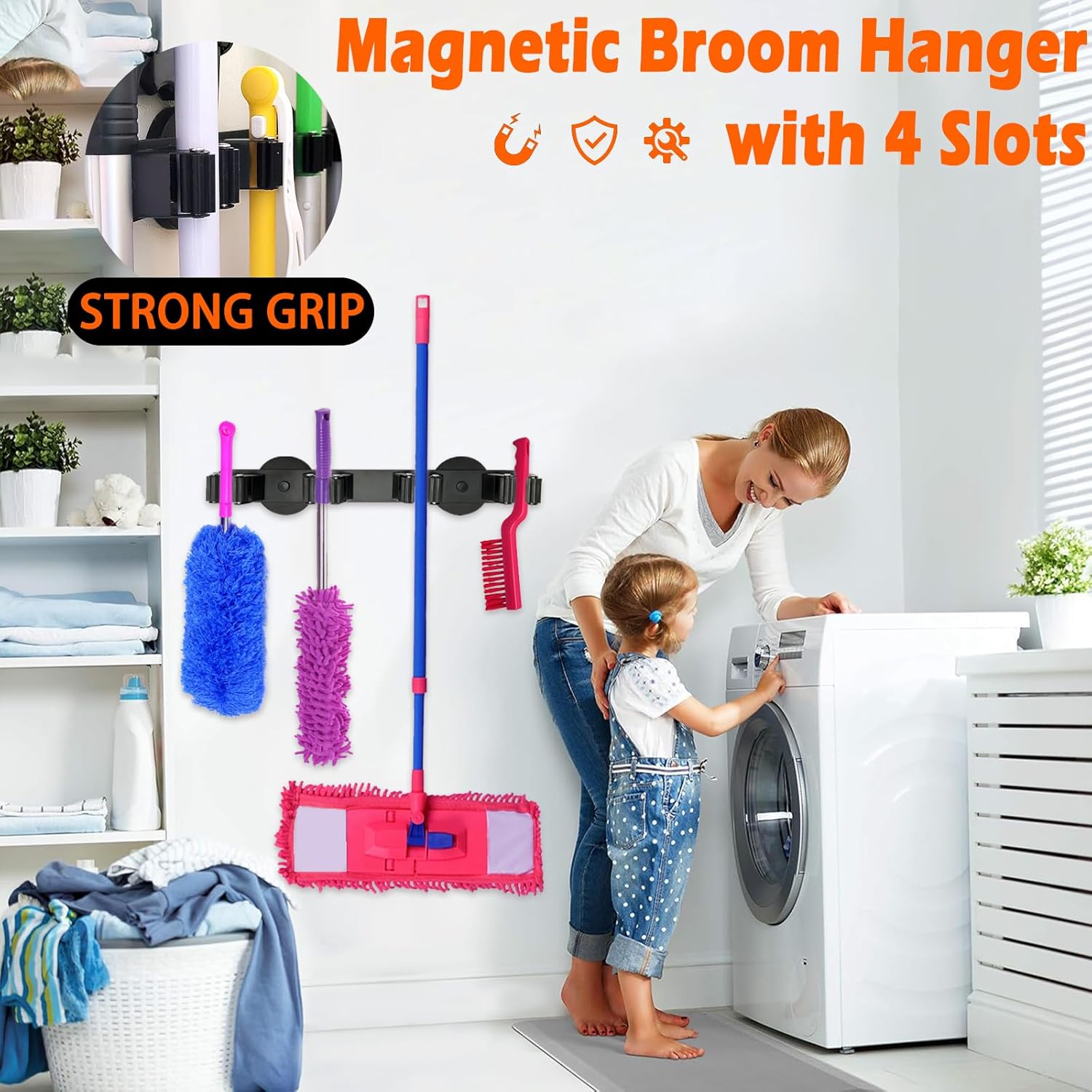 - 【Heavy Duty Magnetic Mop Broom Holder】The magnetic mop holder is designed with 2 powerful magnetic mount base and 4 slots. The magnetic mop holder can be easily fixed on any metal surface without any installation tools.