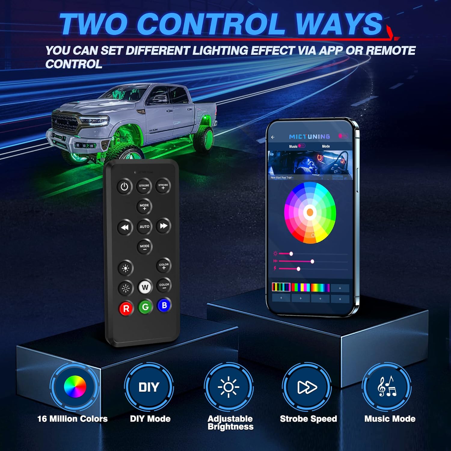- â ăDual Control ModesăCommand your lights like a boss! Use the included remote or MICTUNING EXCLUSIVE MagicLink APP (iOS/Android) to connect multiple lights of SAME TYPE to control. You can combine both RGBW type of Q1 C1 C2 C3 K1 K2 S1 to control together)âONE app rules all! Surprise: Crank up the âMusic Modeâ and let your rig party to the beat