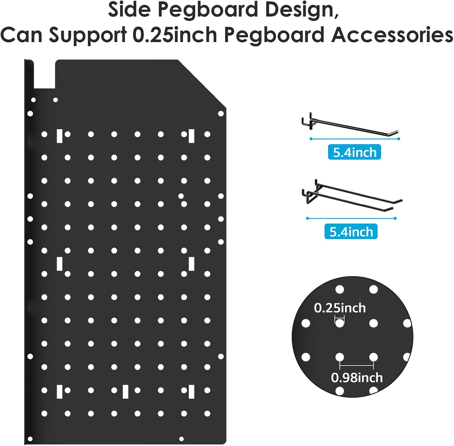 - The difference is the addition of 4 double hooks to store more hanging tools. Like hammers, drills, etc. Side panels are 0.25" pegboard design, come with four 5.4" long hooks and 4 hooks to hang tools, Strong enough and can hang heavy machines. to increase the diversity of storage.