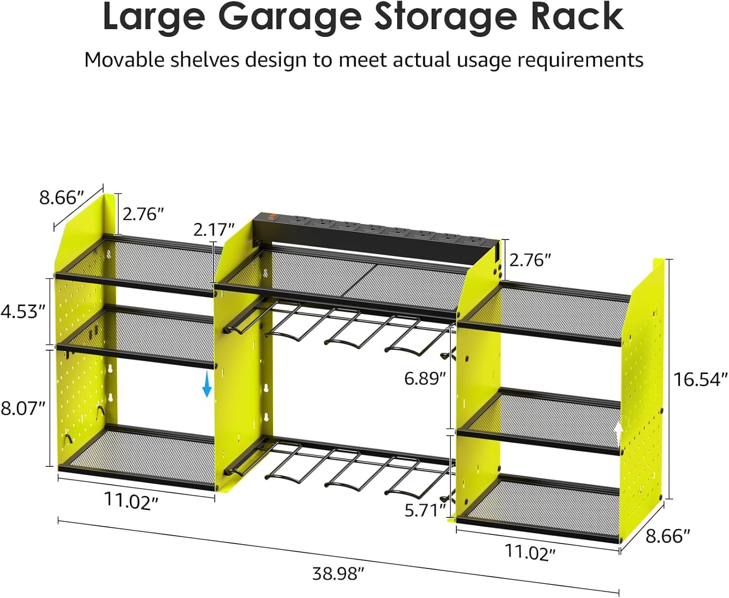 - Green wall mount power tools organizer with power strip, pegboard design, 8 slots, 4 hooks, 4 pegboard hooks and 2 side tool organizer, 3 layer structure shelf and one layer adjustable for actual needs, can keep rechargeable tools organized in the work area and save your bench space.