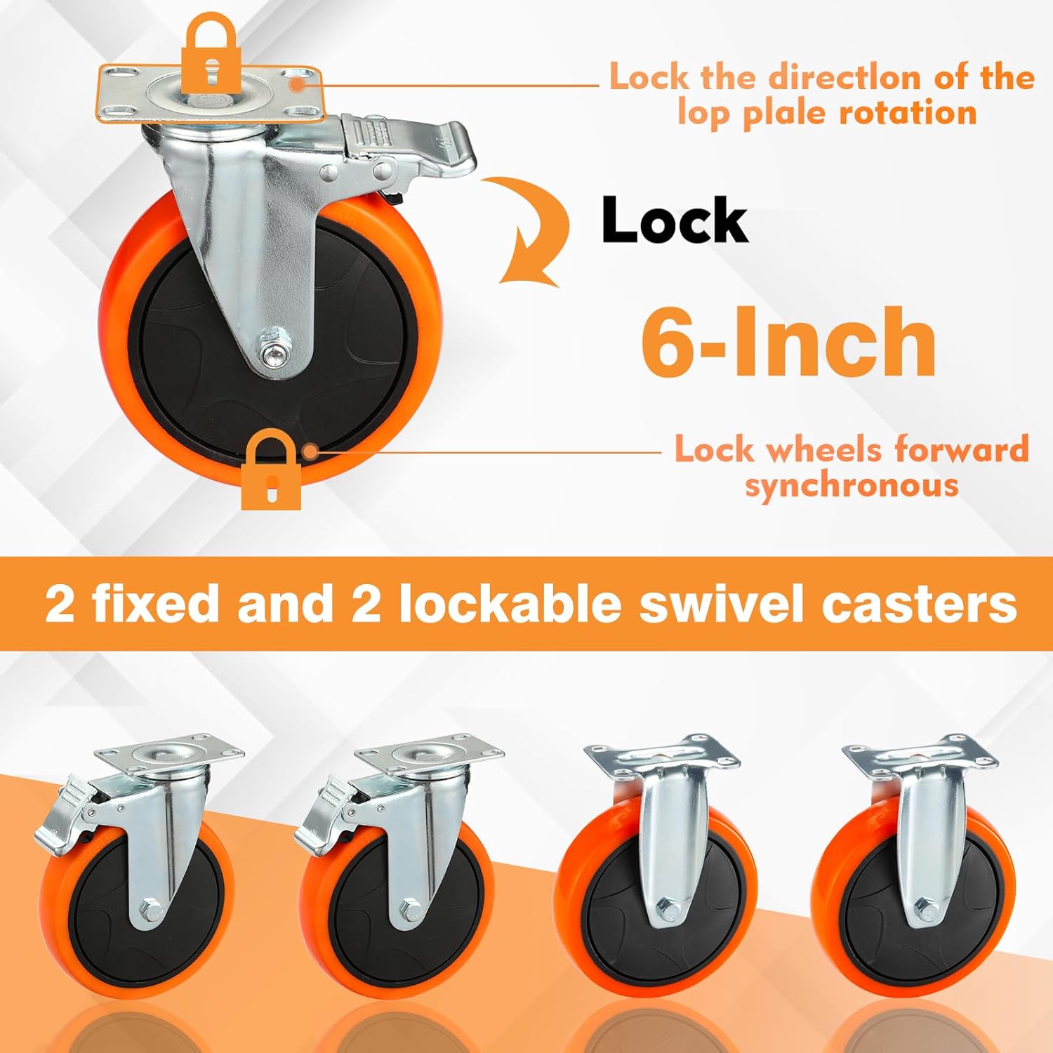 - 🔆 PROFESSIONALLY DESIGNED WHEELS: 2 fixed and 2 swivel 6-inch wheels (2 with Brake) are made of industrial-strength polypropylene and non-marking polyurethane (PU) rubber. The swivel wheels can easily rotate 360 degrees flexibly, and the inner double ball bearings make the rotation and rolling more effortless and labor-saving. The locking mechanism synchronously locks the rotation and the wheel frame, thus achieving effective and fast braking.