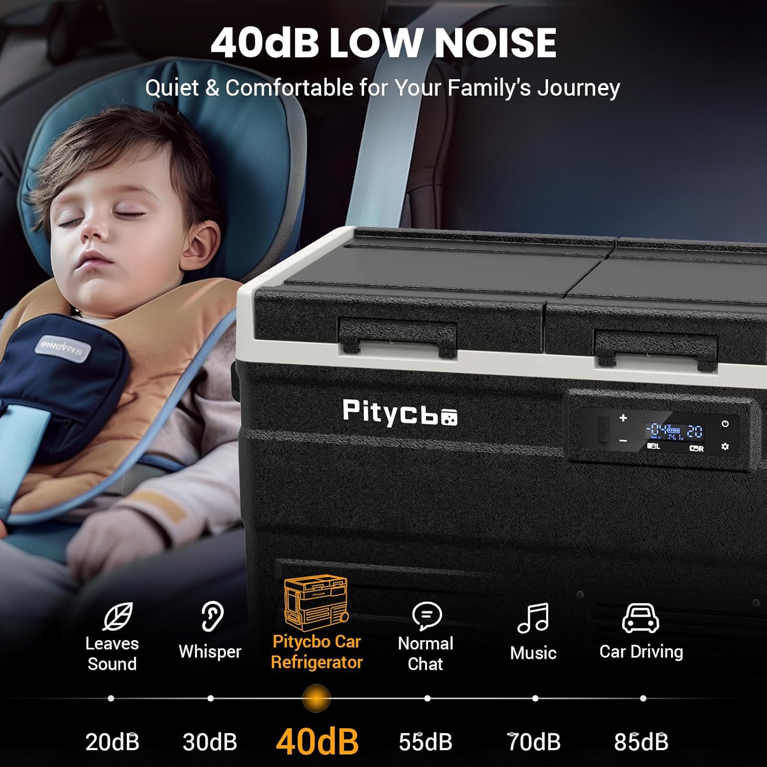 - Low Noise and Anti-Shaking: Our car refrigerator is as low as 40dB, running quietly, even if you are driving late at night or camping for a nap, it won't disturb your sleep. Say goodbye to start-up and bumpy noise, leaving only freshness and tranquility, making every journey comfortable and pleasant; Equipped with advanced anti-vibration technology, fearless off-road challenges, even if the road is tilted to the extreme angle of 30 °, but still ensure that the refrigerator is running steadily!