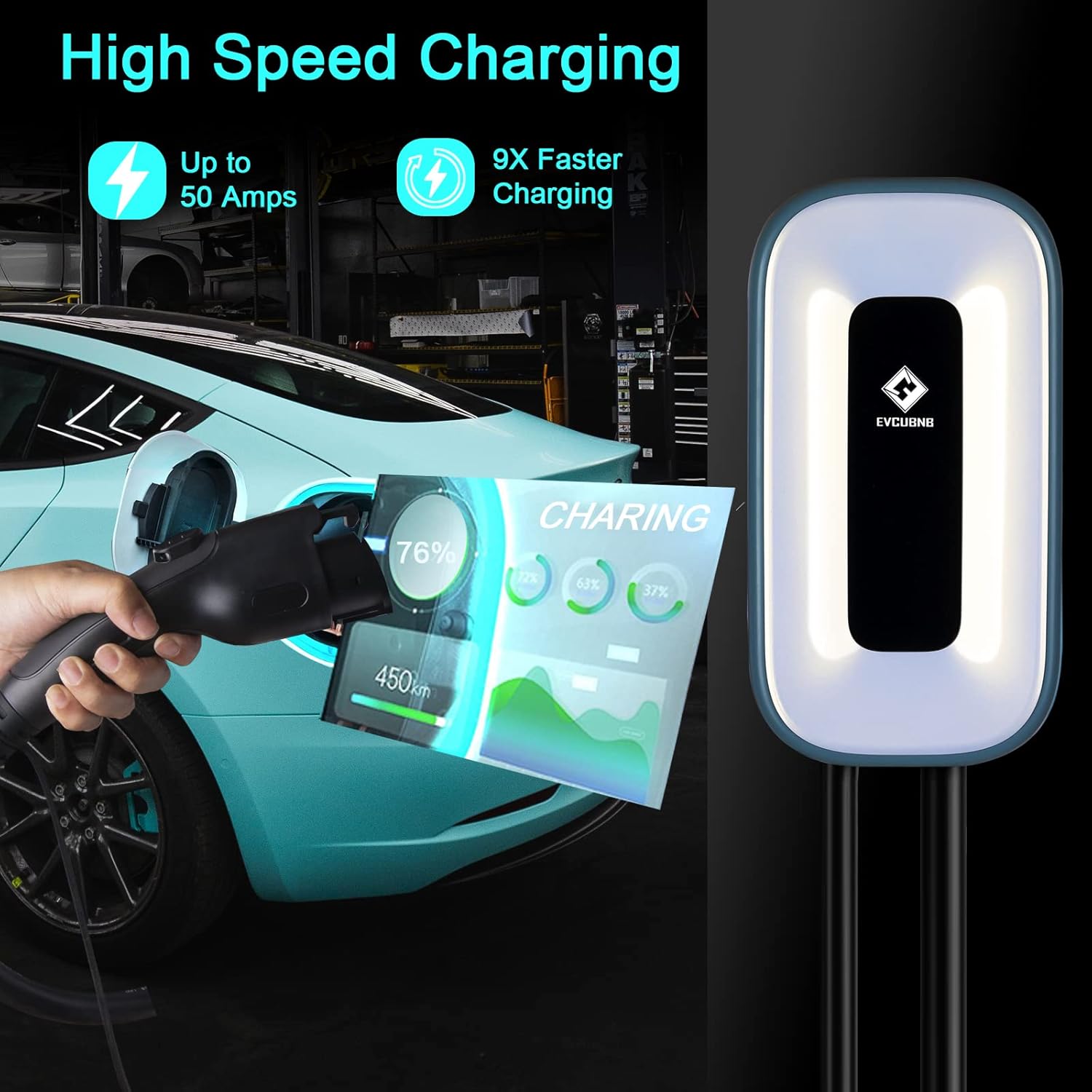 - 【SPEED】Provide you up to 50 amperes and 12KW charging power, ensuring you get back on the road quickly. With “Plug and Charge” technology, it simplifies the charging process, preventing frustration and inconvenience caused by Wi-Fi issues, poor network connectivity, low phone battery, or charging app malfunctions during electric vehicle charging.
