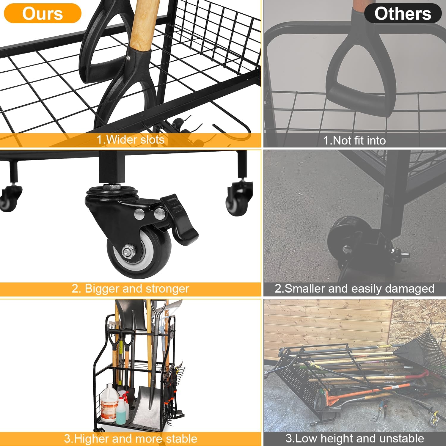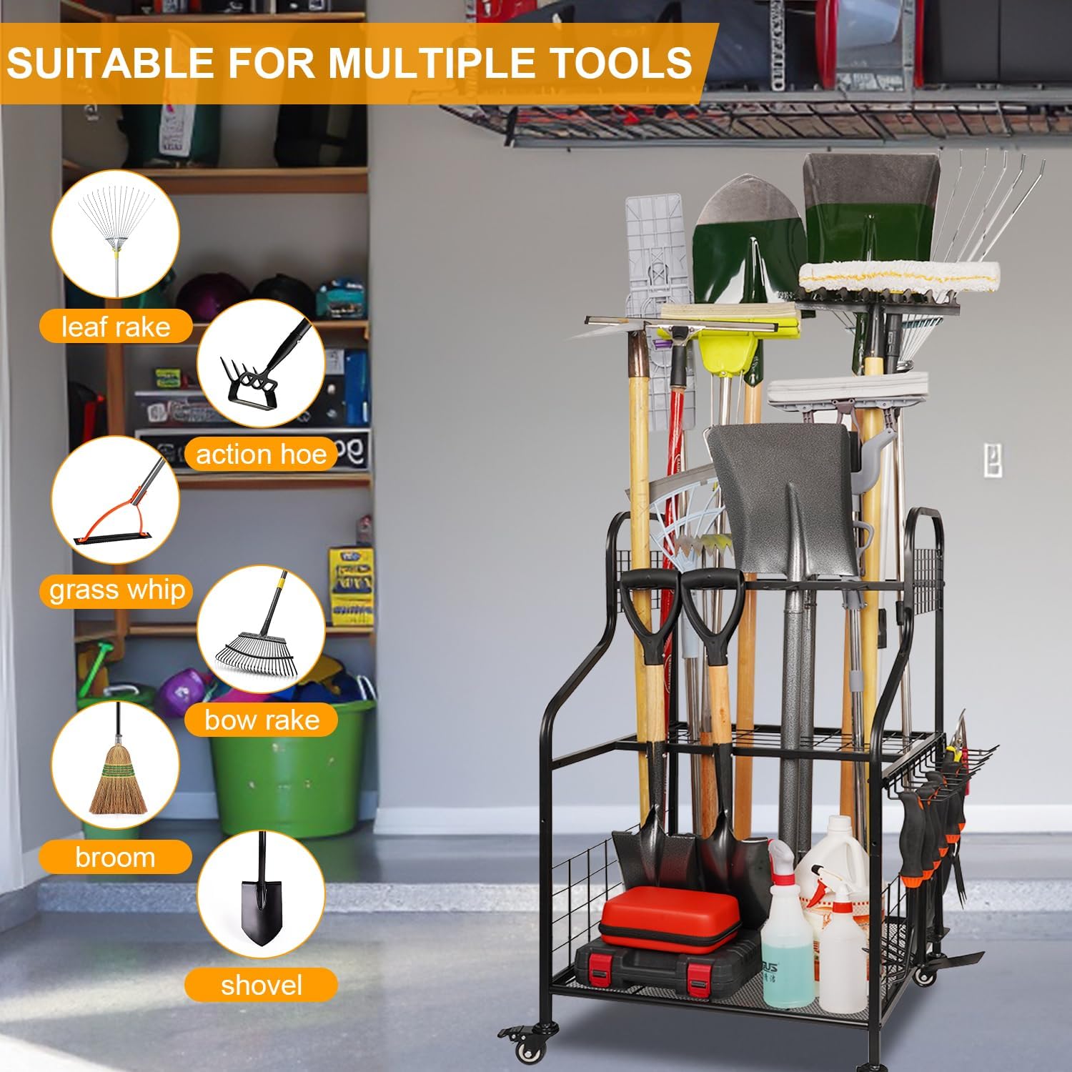 FZK Garden Tool Organizer,Heavy Duty Steel Yard Tool Organizer for Garage,Up to 49 Long-Handled Tools, Garden Tool Storage with Wheels,Garden Tool Organizer for Garage,Black