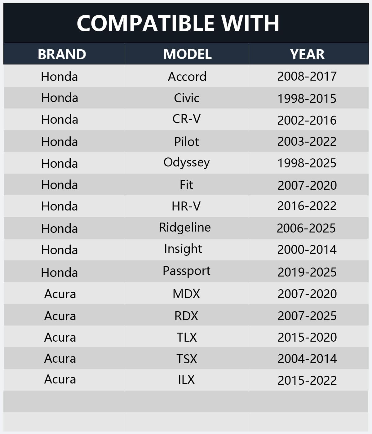 - Suitable Models: Compatible with Honda Accord 2008-2017, Civic 1998-2015, CR-V 2002-2016, Pilot 2003-2022, Odyssey 1998-2025, Fit 2007-2020, HR-V 2016-2022, Ridgeline 2006-2025, Insight 2000-2014, Passport 2019-2025; Acura MDX 2007-2020, RDX 2007-2025, TLX 2015-2020, TSX 2004-2014, ILX 2015-2022