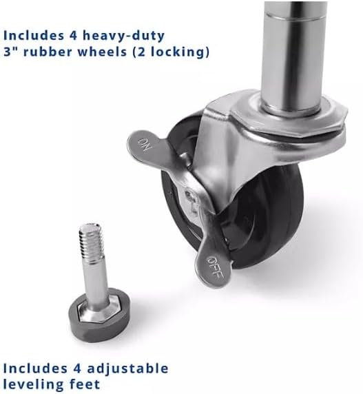 - 6-tier shelving with weight capacity of 1,000 lbs. per shelf on leveling feet (800 lbs. on wheels)