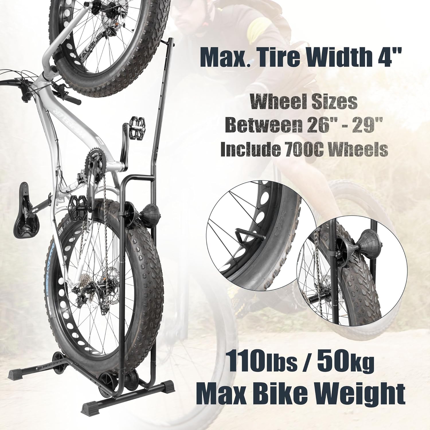 - COMPATIBILITY - Our fat ebike stand is suitable for most bikes with wheel sizes ranging from 26" to 29" for MTBs and 700c road bikes, as well as fat tire bikes with a maximum tire width of 4". With a weight capacity of up to 50 kg / 110 lbs, this bicycle rack is an ideal fit for heavy e-bikes. Please note that this bicycle storage stand is NOT COMPATIBLE with bikes that come with vintage-style rear mudguards.