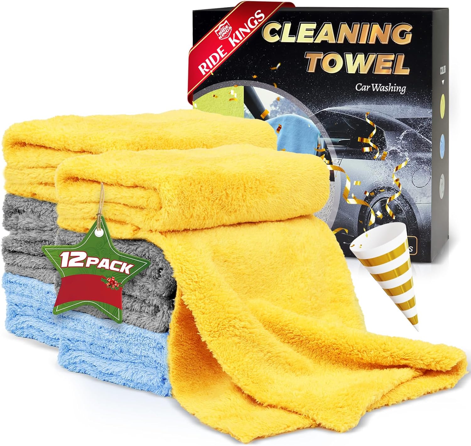 Car Wash Drying Towels,Coral Fleece , For Car,SUV,RV,Motorcycle ,Boat,Home ,Kitchen,Absorbent, Lint-Free, Extra Soft,Reusable and Durable,Interior Microfiber Rags 16in x 16in-12 Packs Blue+Yellow+Grey