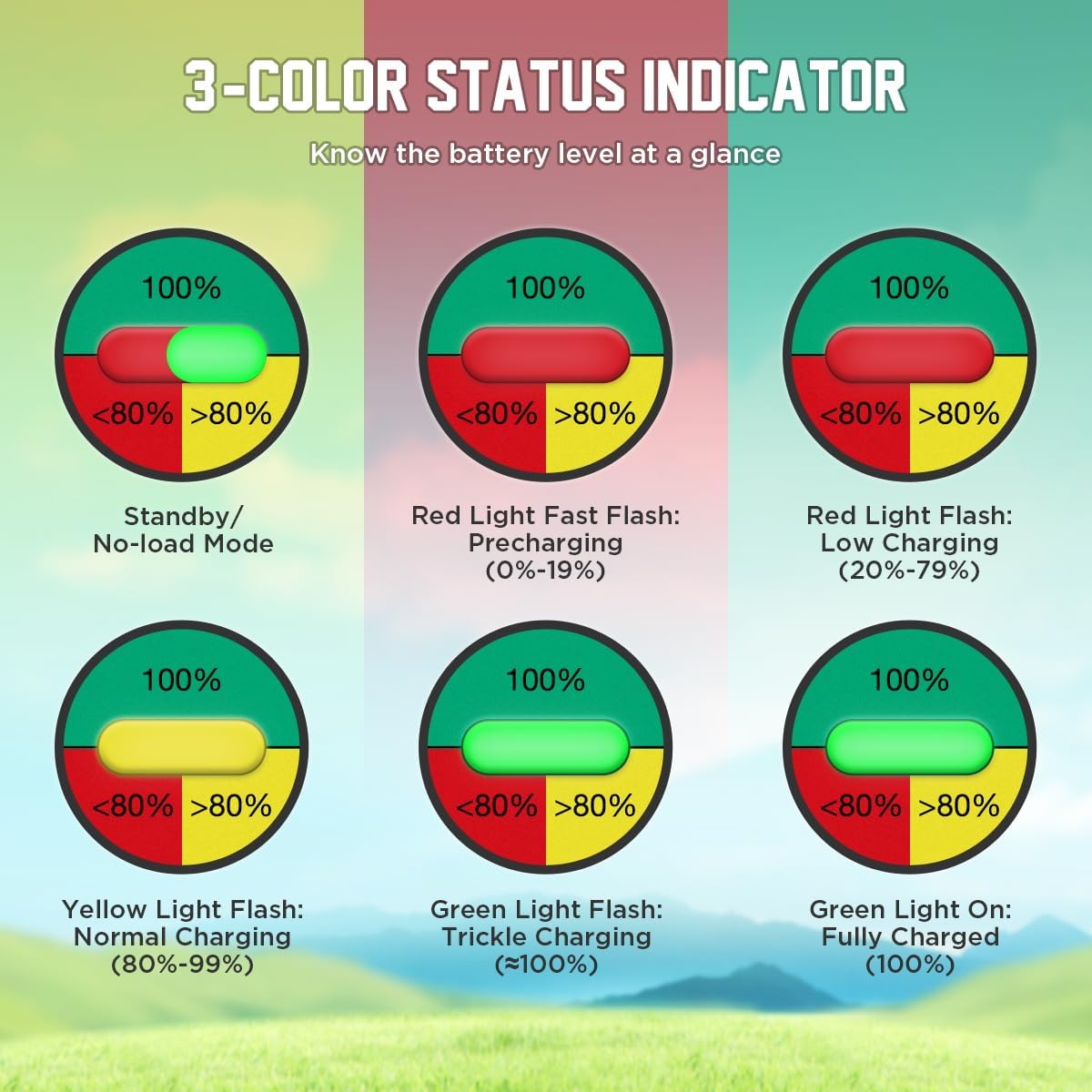 - 【3-Color Status Indicator】The 48 volt ezgo golf cart charger has a 3-color indicator light that help you to know the battery level at a glance. 1) Red Light Fast Flash: Precharging(<20%); 2) Red Light Flash: Constant current charging (20%~80%); 3) Yellow Light Flash: Constant-voltage limitary-current charging (>80%); 4) Green Light Flash: Trickle charging(≈100%); 5) Green Light is Always On: Fully charged (100%).