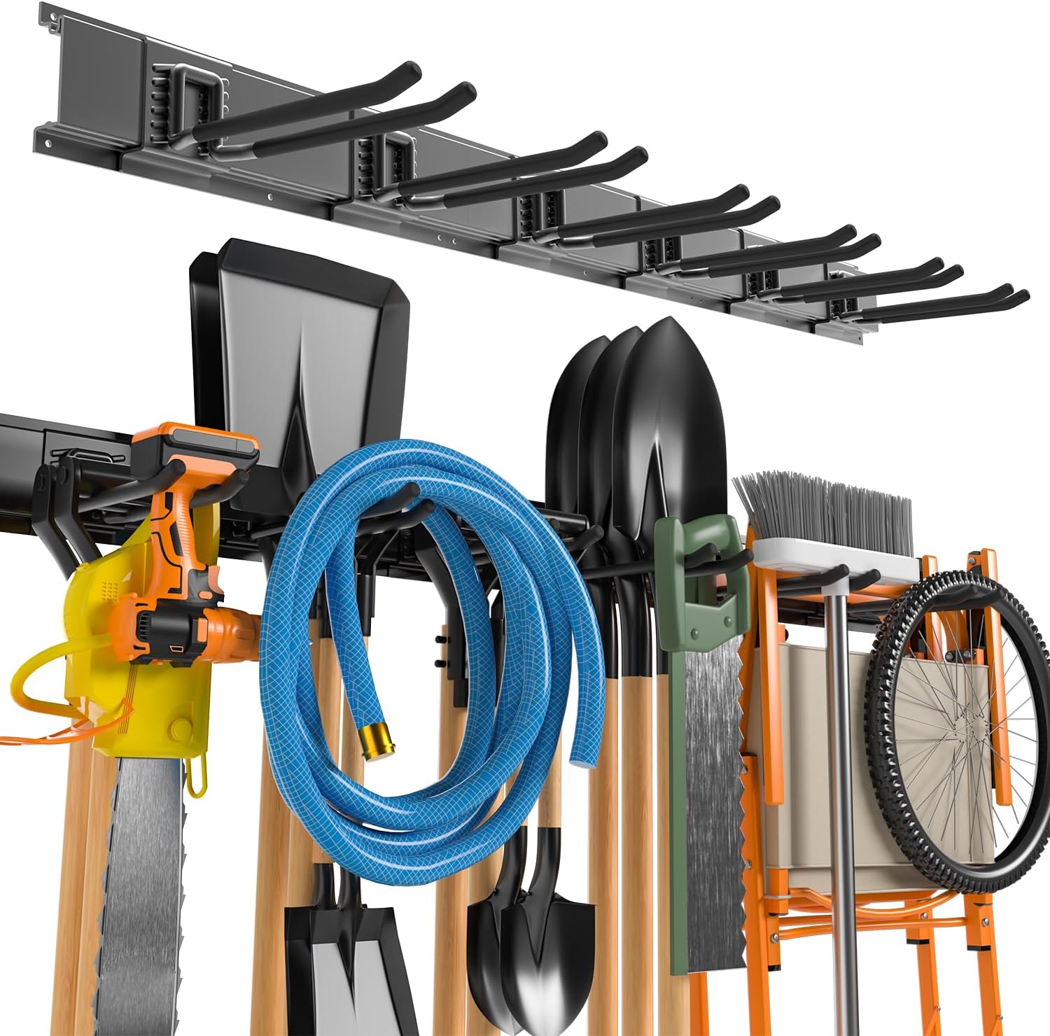 Garage Tool Organizer Wall Mount, 49.5 Inch Garage Organization and Storage Heavy Duty with 3 Packs Rails and 6 Adjustable Hooks, Garden Yard Tool Hanger Rack for Shovel, Max Load 600lbs
