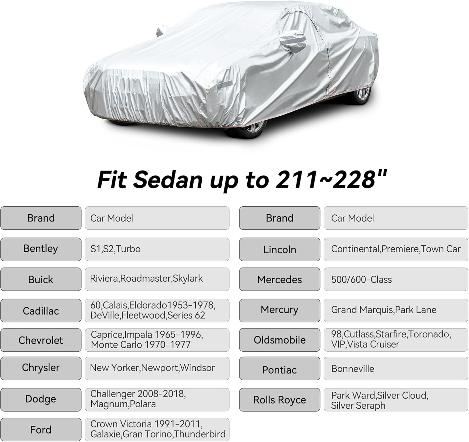 - ăChoose the Right ModelăThis large car covers for automobiles is universal fit for sedan which length is up to 228 inch.See the product images for applicable vehicle models.The universal car cover comes with a storage bag,you can store it easily when not used.