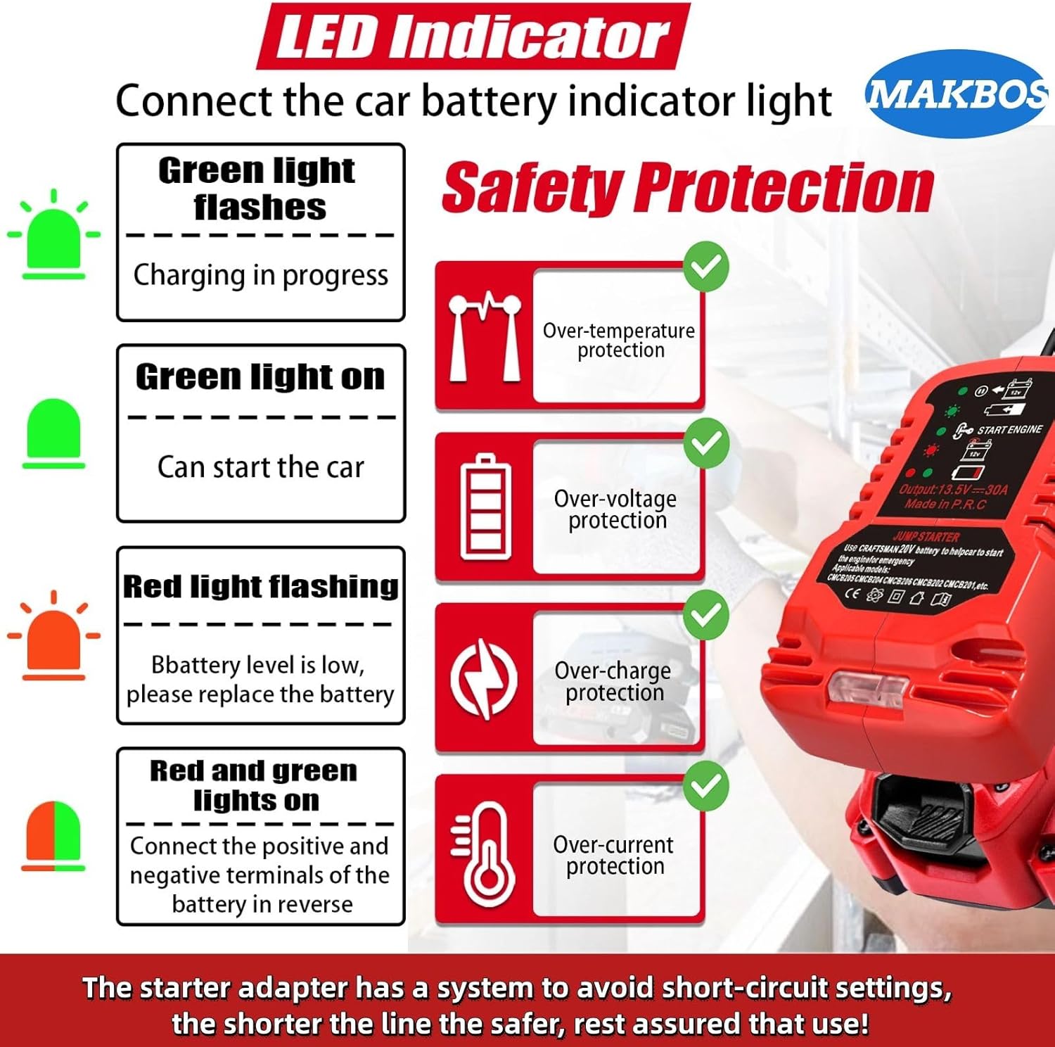 - [Compatible With Craftsman 20V Batteries]: The MAKBOS jump cable Charegr adapter is Assist in starting,compatible with Craftsman batteries 20V lithium-ion batteries,Up to 3.5L Gas or 6.5L Diesel Engines and moreFor Jump Starting Car Using Tool Battery,Engine12V Auto Battery Booster.(Notice:Battery not included).