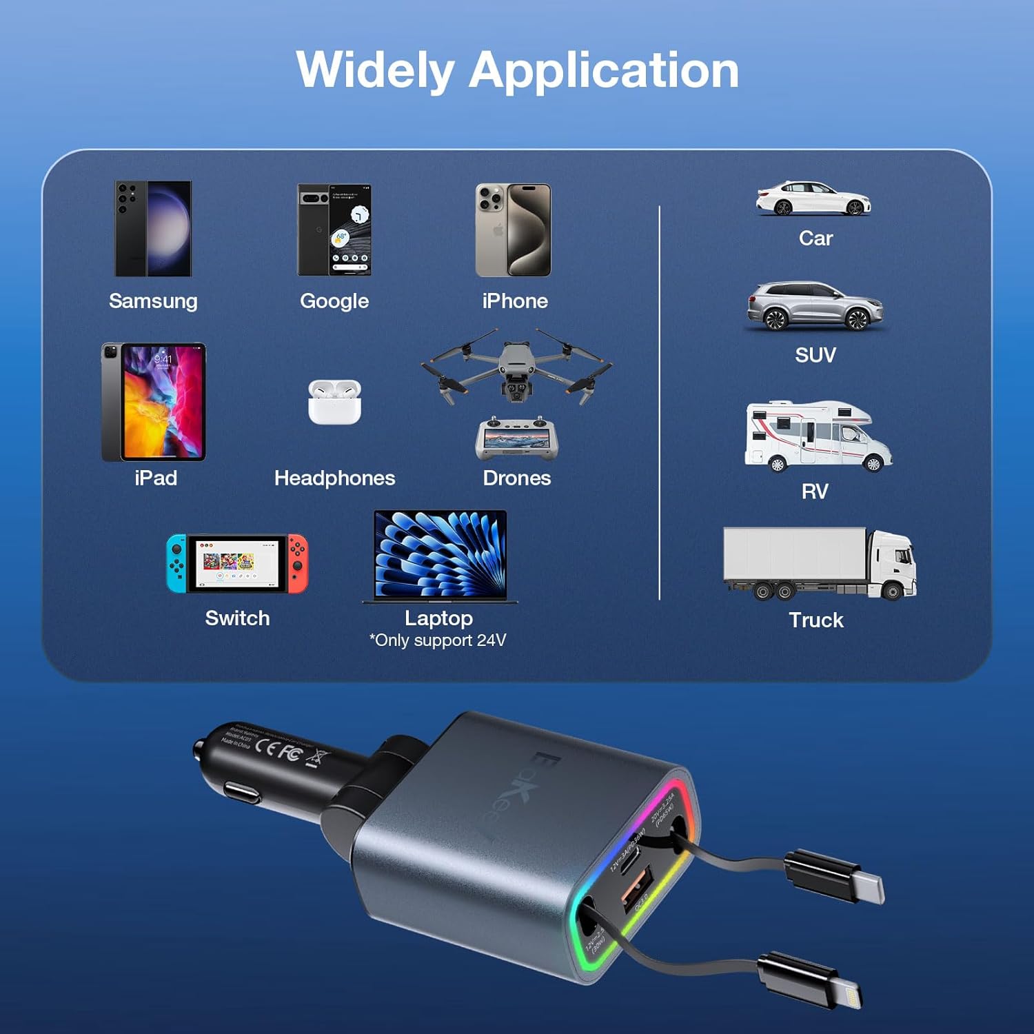 - Say Goodbye to Tangled Wires: This 4-in-1 car charger offers two 31.5 inch retractable cables for a neat car interior. This car charger adapter is fun for family road trips, ensuring both front and back seat devices stay charged