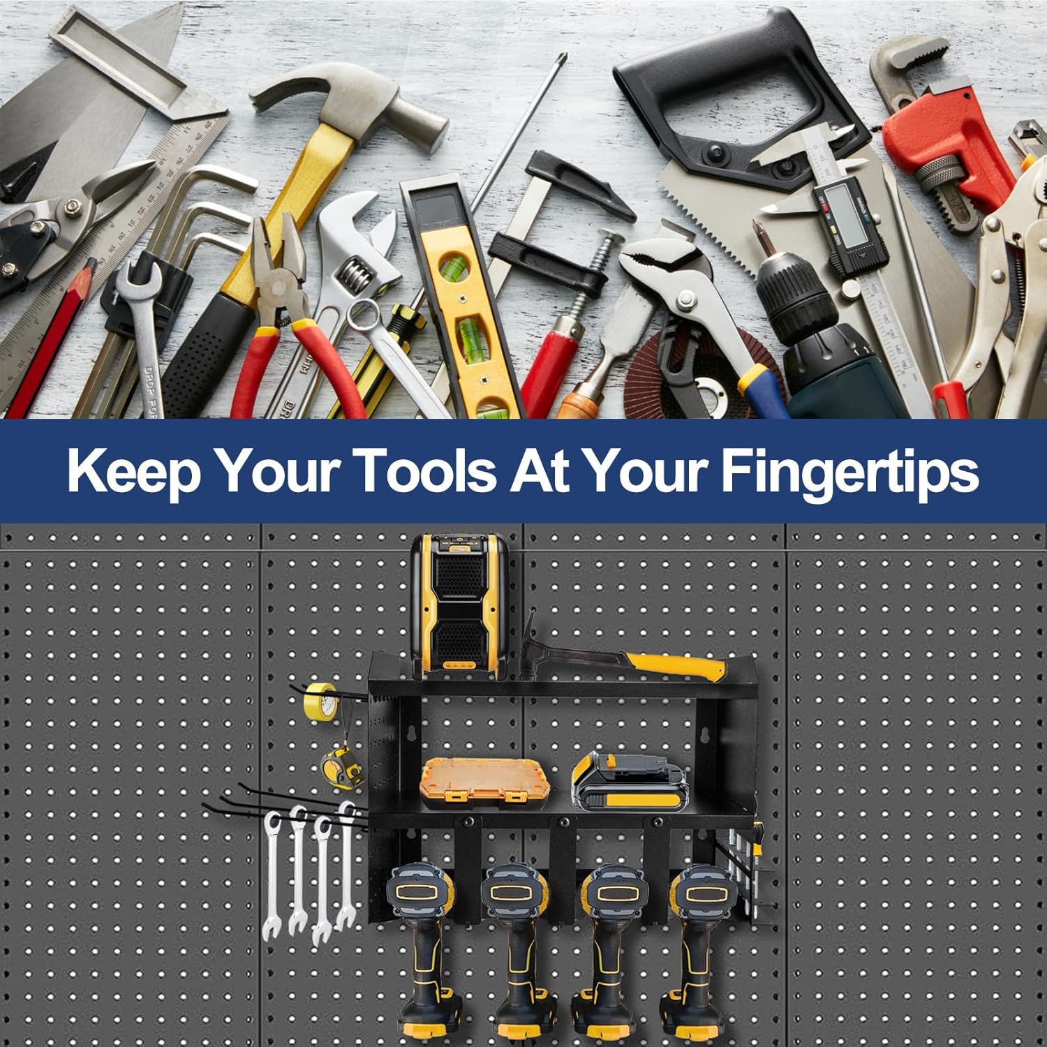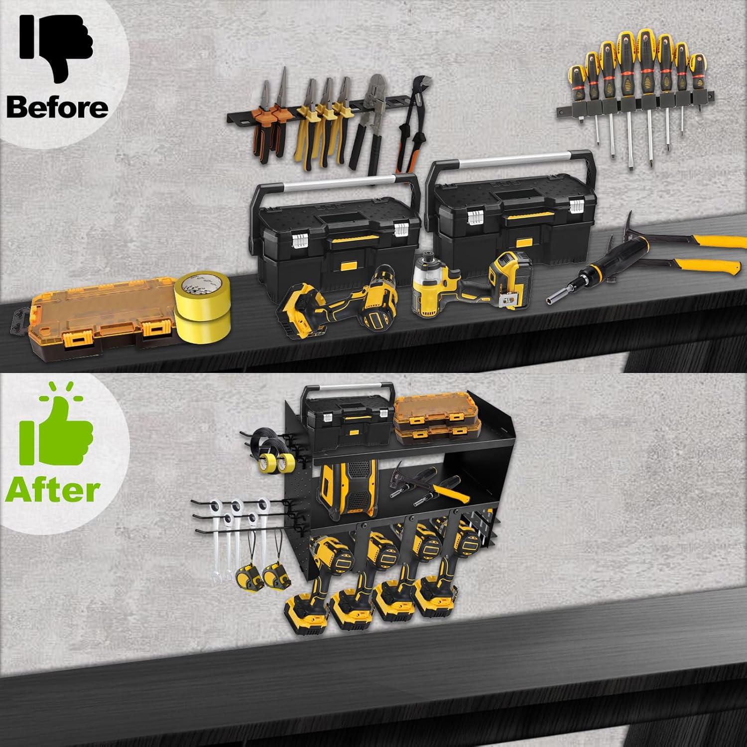 - Robust 80LB Load Capacity: Constructed from high-quality iron with precision cutting and a reinforced structure, this power tool storage rack ensures durability and a strong load-bearing capacity, eliminating worries about breakage or wall damage.