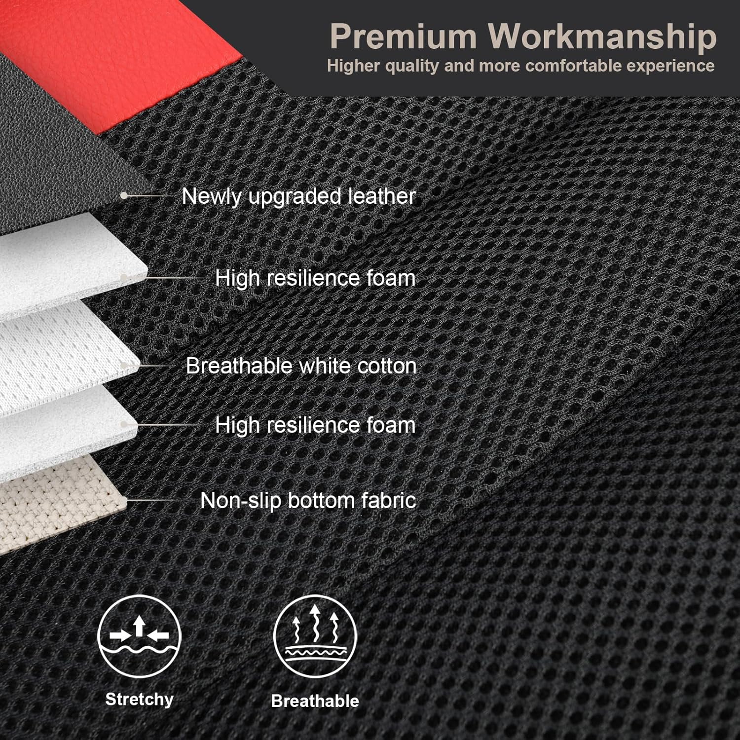 - Our car seat covers combine premium faux leather with breathable mesh fabric. The faux leather provides a luxurious look and durability, while the honeycomb mesh design on the backrest and seat ensures excellent breathability and cooling, keeping you comfortable during long drives and in hot weather