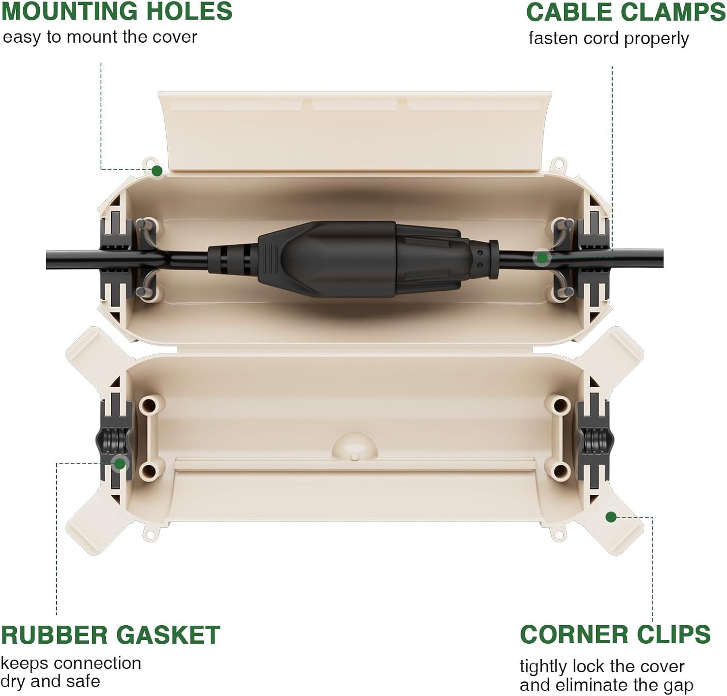 - Easy to use, place the connection into the safety seal enclosure and clip the cord with the clamps. To hang the cover, use the included cable ties and insert them to the side mounting holes. And this color can blend with your deck very well.