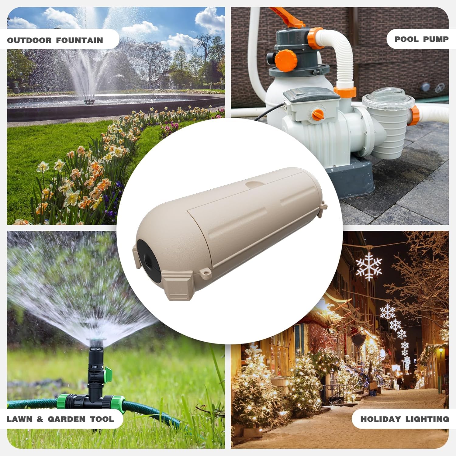 - Ideal for a wide range of outdoor & indoor applications including lawn and garden power tools, Christmas holiday lighting, landscape decorations, pool pumps, fountains, fish ponds, patio heaters, air conditioners, security cameras and more.