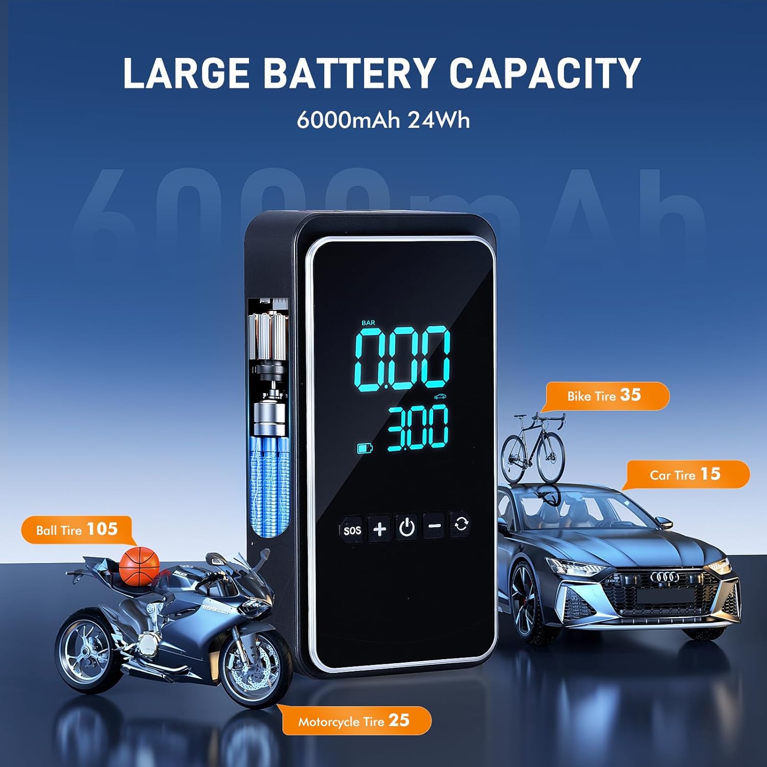 - Multipurpose Portable Air Compressor:Integrated Design (Inflator,Power Bank And Flashlight) On The Top Of This Air Pump Is A LED light Providing Convenience For You To Inflate And Change Tires In The Dark. On The Bottom There Is A 5V/2A USB-C Input Port And A 5V/2A USB-A Output Port, Making It An Emergency Power Supply For Your Phone.