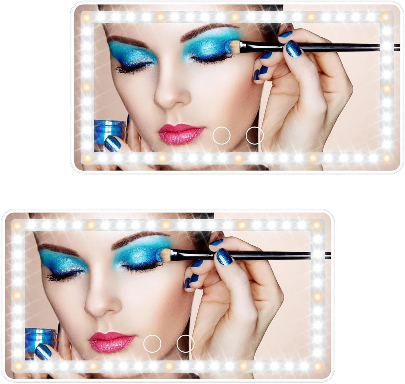 - ăDIMMABLE BICOLOR LED LIGHTSă-The car makeup mirror has 12 yellow lights and 48 white lights, which is 40% brighter and 60% less energy than normal bulbs. Short press the 2 sensor switches to replace 3 light colors: white, yellow, white and yellow. Long press for dimming according to what you need. 2500-6500K color temperature is equivalent to outdoor sunlight, the makeup is naturally no difference.