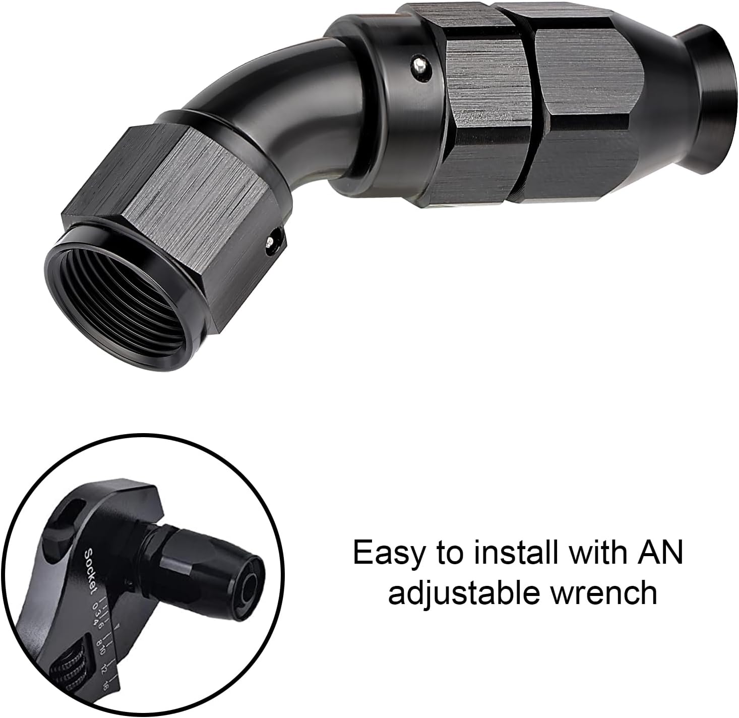 - [Application] These fittings are ONLY used with PTFE fuel lines for E85, alcohol, nitro, clutch, nitrous, power steering, oiling, hydraulics, and vacuum applications. A 360° swivel design allows for easy assembly.