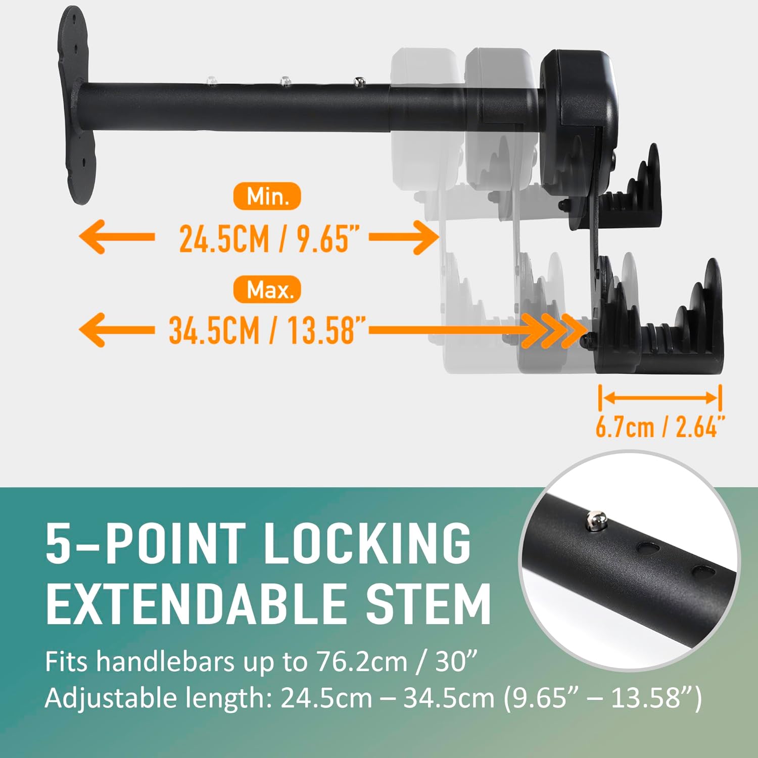 - Adjustable & Secure Design – Telescoping arm extends from 8.5” to 12” (20–30cm) to fit different handlebar widths. Locking mechanism keeps your bike stable and level on the wall.