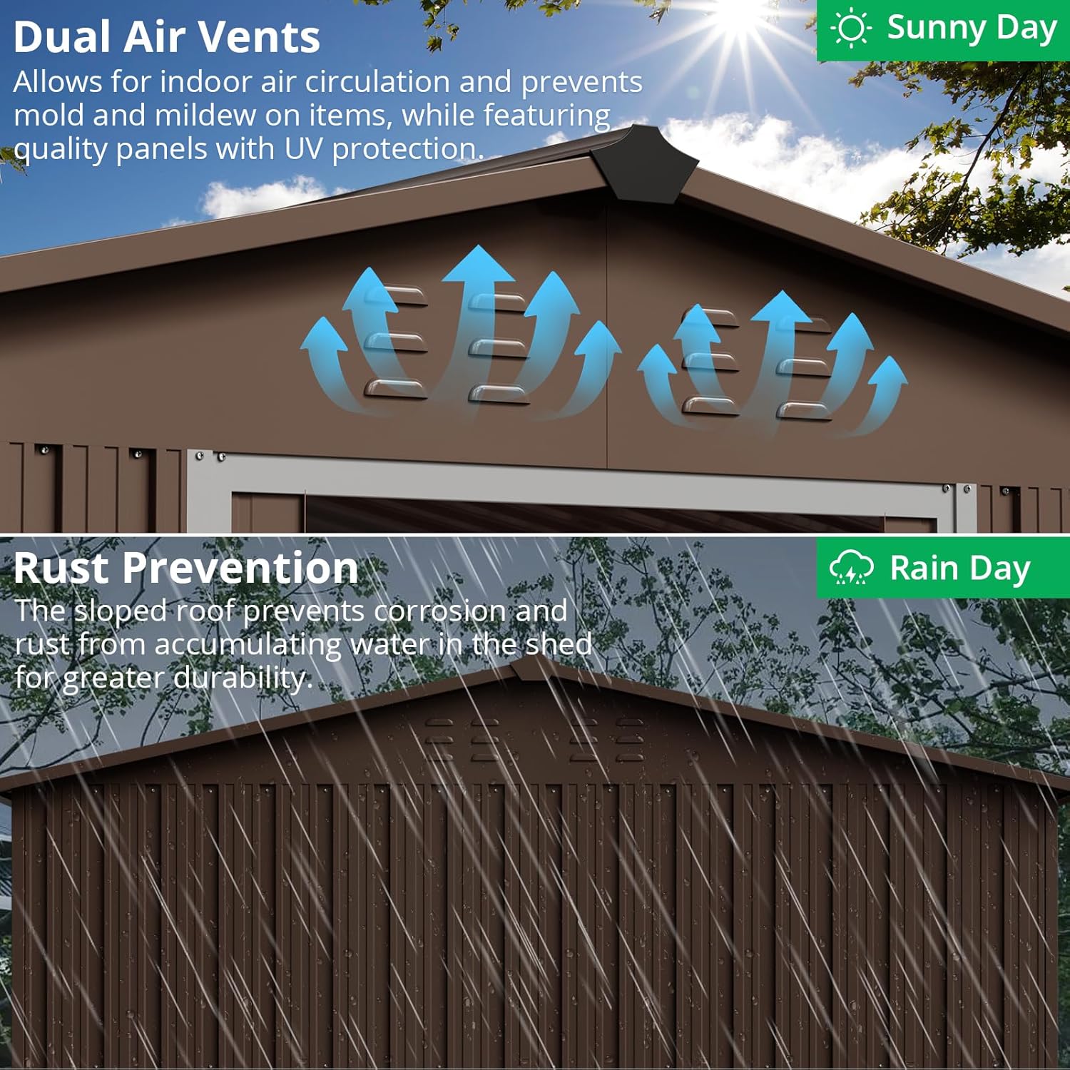 - Ventilated & Sloped Roof Design: Designed with a sloped roof for quick drainage, this patio shed prevents water accumulation and rust. It also features ventilation openings to ensure airflow, keeping the interior dry and preventing mold on your stored items.