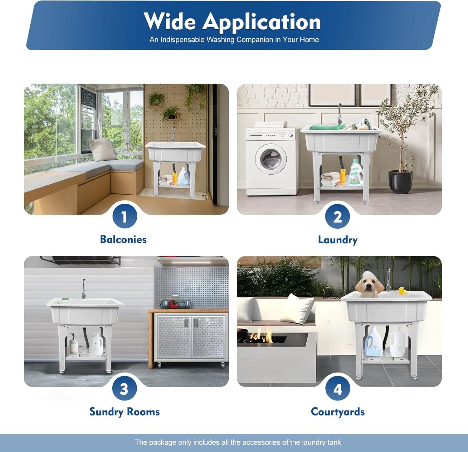 - ●【Application】The free standing laundry room basin is applicable to laundry, bathrooms, sundry rooms, garages, basements, balconies, courtyards, gardens, etc. It can be used as a cleaning tank, pet bath, or storage rack.