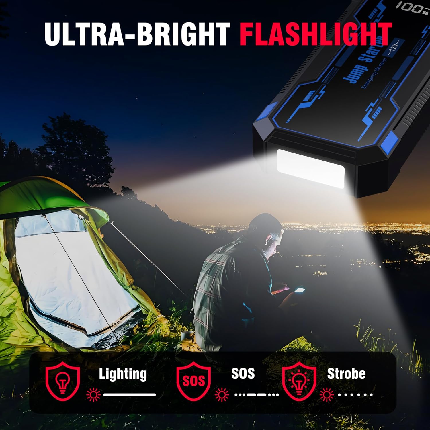 - ăUltra-Bright Emergency LED FlashlightăThe high lumens flashlight with light/strobe/SOS 3 lighting modes give you 100% visibility at night. In an emergency, this car jumper battery pack is a reassuring lifesaver in the dark when camping, hiking, or on an adventure trip. Unique led display can detect and display the operational status and battery level.