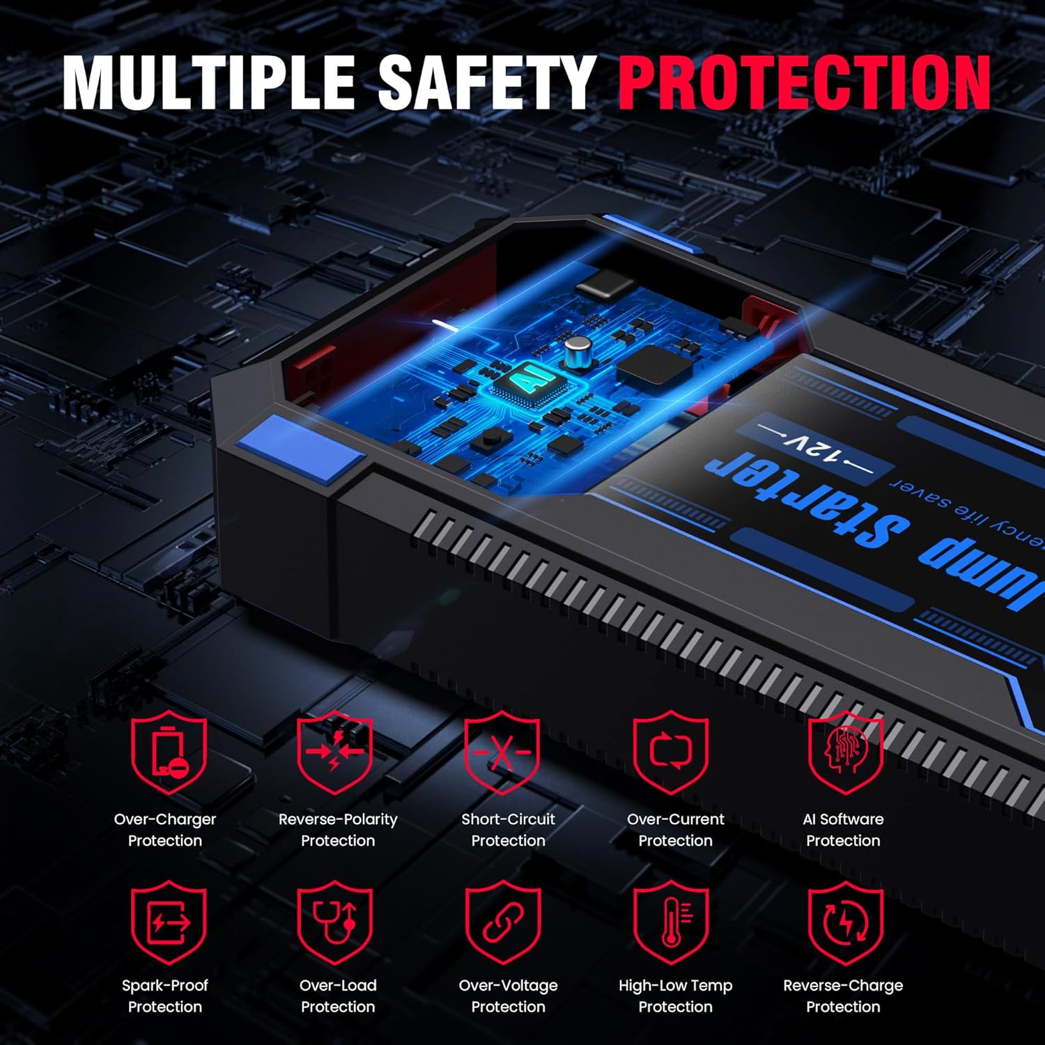 - ăSmart IC and Ultra Safe DesignăMore performs in safety efficiency and compatibility etc with Advanced intelligent controlling IC 100% checked and continuous aging test which it will brings you unprecedented convenience. Upgraded Built-in 10 multi-protection system and premium microchips to ensure your safety to the maximum. Trustworthy Car Battery Jump Starter with 3 Years Warranty!