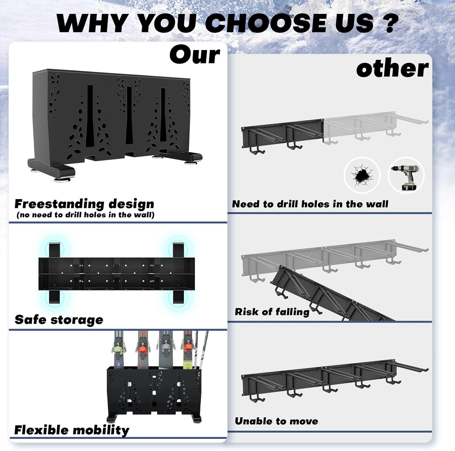 - Ideal for Snowboard and Ski Enthusiasts – Whether for your garage, home, or ski lodge, this versatile rack offers a convenient storage solution for ski and snowboard lovers, keeping your equipment safe and ready for the next adventure.