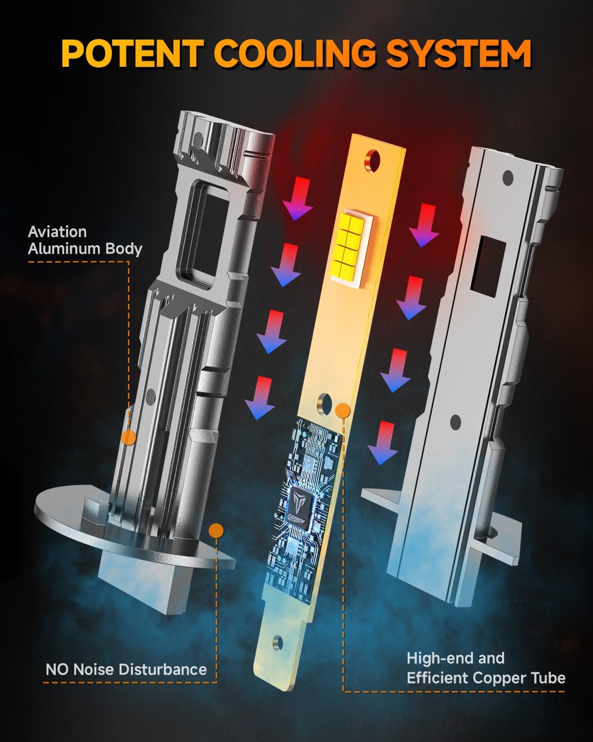 - Over 6,0000 Hours Lifespan: This H1 bulb offers over 60,000 hours of use, made from aviation aluminum and a large copper baseboard. A high-speed cooling fan efficiently dissipates heat, ensuring stable illumination without frequent replacements.