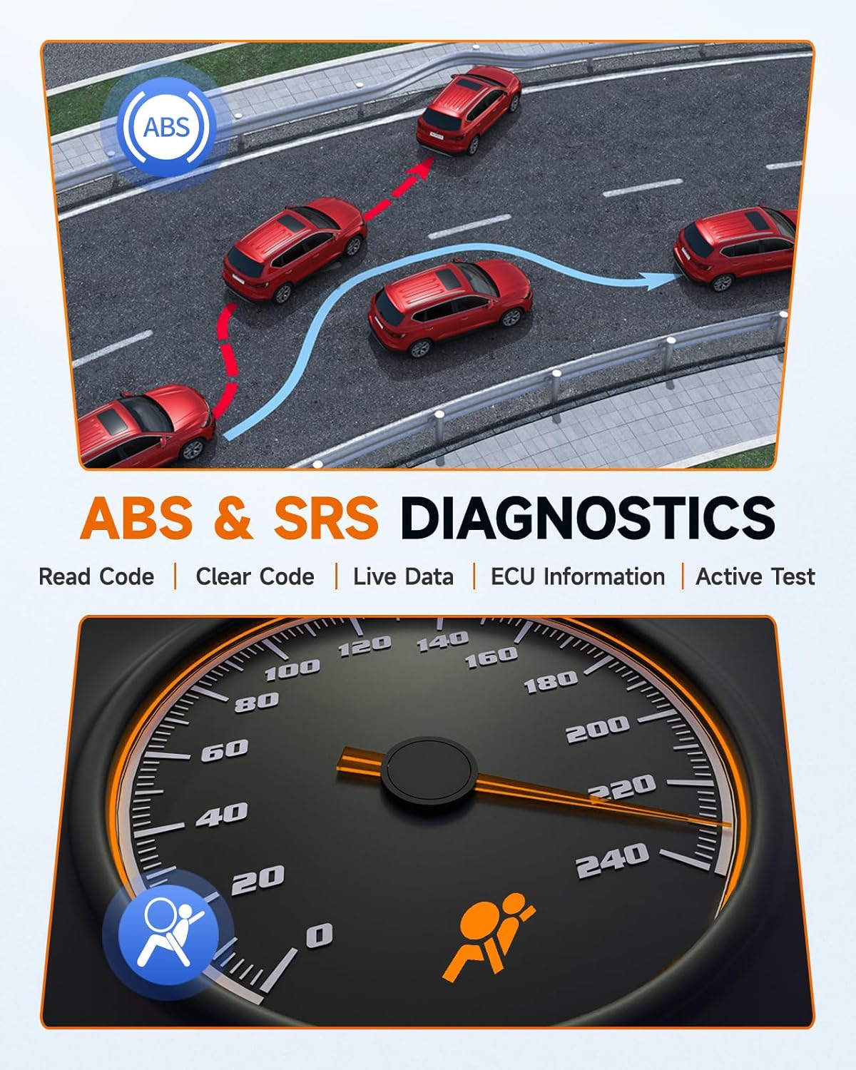 - Pro Level ABS SRS OBD2 Diagnostics - The NT630 Pro goes beyond basic OBD2 code readers that only detect engine codes by offering in-depth diagnostics for ABS and SRS systems. It reads ECU information, retrieves trouble codes, and displays live data from components like wheel speed sensors, brake switch and pedal signals, hydraulic unit status, and airbag modules. After repairs, it can clear ABS error codes and turn off the ABS warning light (Note: airbag codes cannot be cleared). This professional-grade scan tool also includes key reset functions like ABS Bleeding, BMS, Oil, EPB, and SAS Reset, along with active test for the ABS system.
