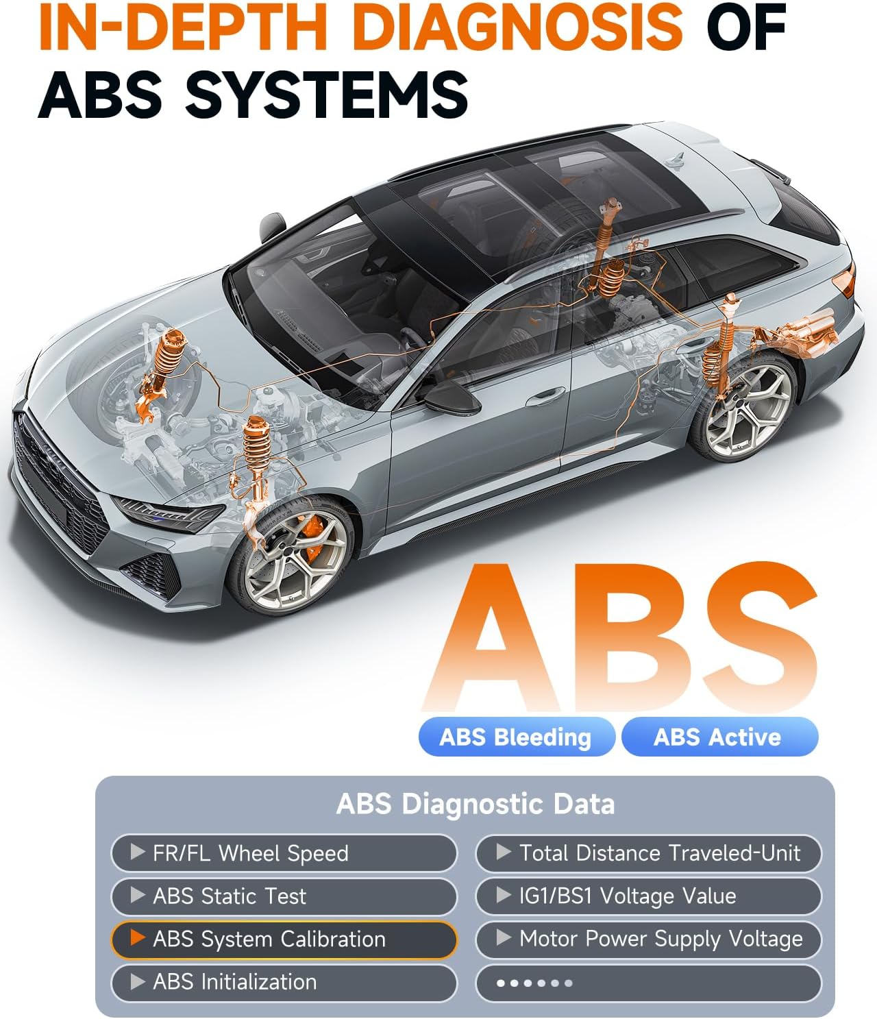 - Full-Scale ABS Diagnostics Easily - Dive deep into your vehicle’s ABS system with Foxwell Scanner, allowing live data monitoring of wheel speed sensors (FR/FL), static tests, system calibration, and ABS initialization. Dynamic chart format simplifies problem diagnosis. This ABS scanner reads fault codes, shows freeze frame data, and supports active tests like auto/manual brake bleeding, motor test, version check, all essential for resolving warning lights, uneven braking, or pedal issues—takes the guesswork out of ABS repairs, giving DIYers or pros valuable data before visiting a shop.