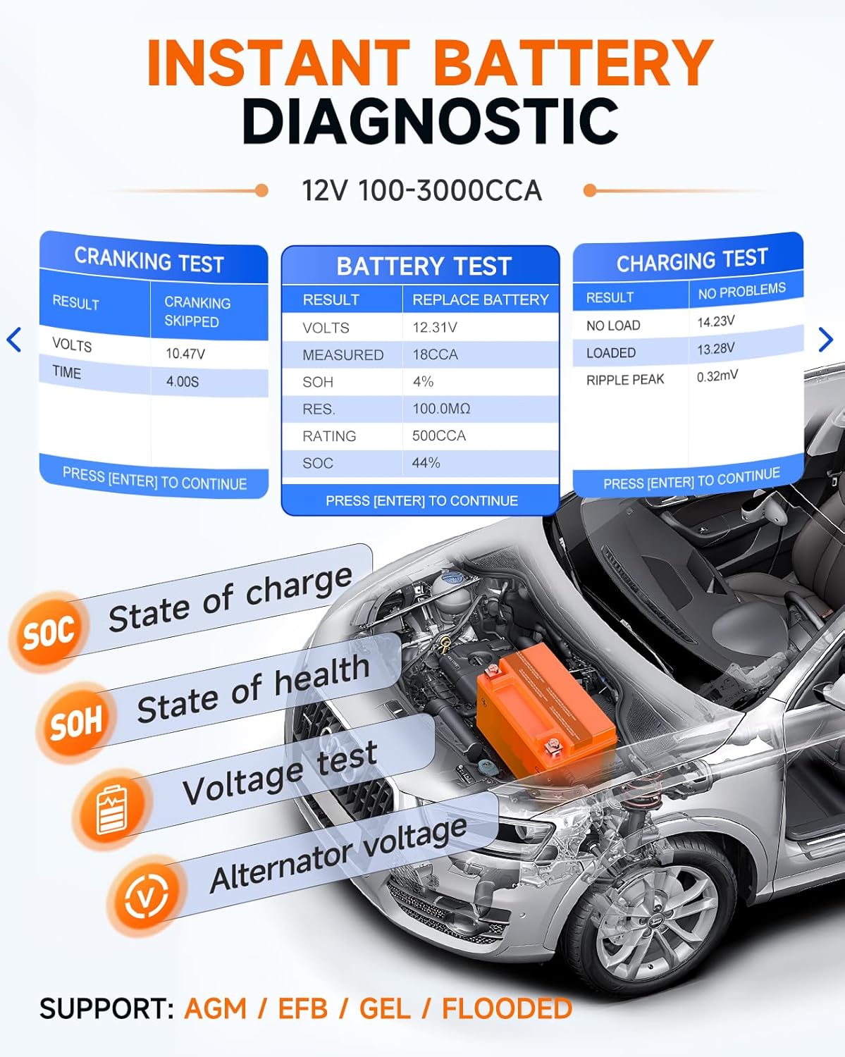 - Built-In Full Battery Status Analysis - Unlike other auto scanners that only show basic voltage, this scan tool with battery tester offers full 12V battery analysis like the FOXWELL BT301, testing SOC, SOH, internal resistance, cranking performance, and alternator voltage (load/no-load)—helping you spot weak batteries before they fail. This obd2 with battery tester handles 100–1100 CCA batteries (Regular, EFB, AGM, GEL) and displays results on a bright 2.8″ color screen. No separate tester needed—know when to recharge or replace, avoid dead batteries, and cut downtime with one smart device.