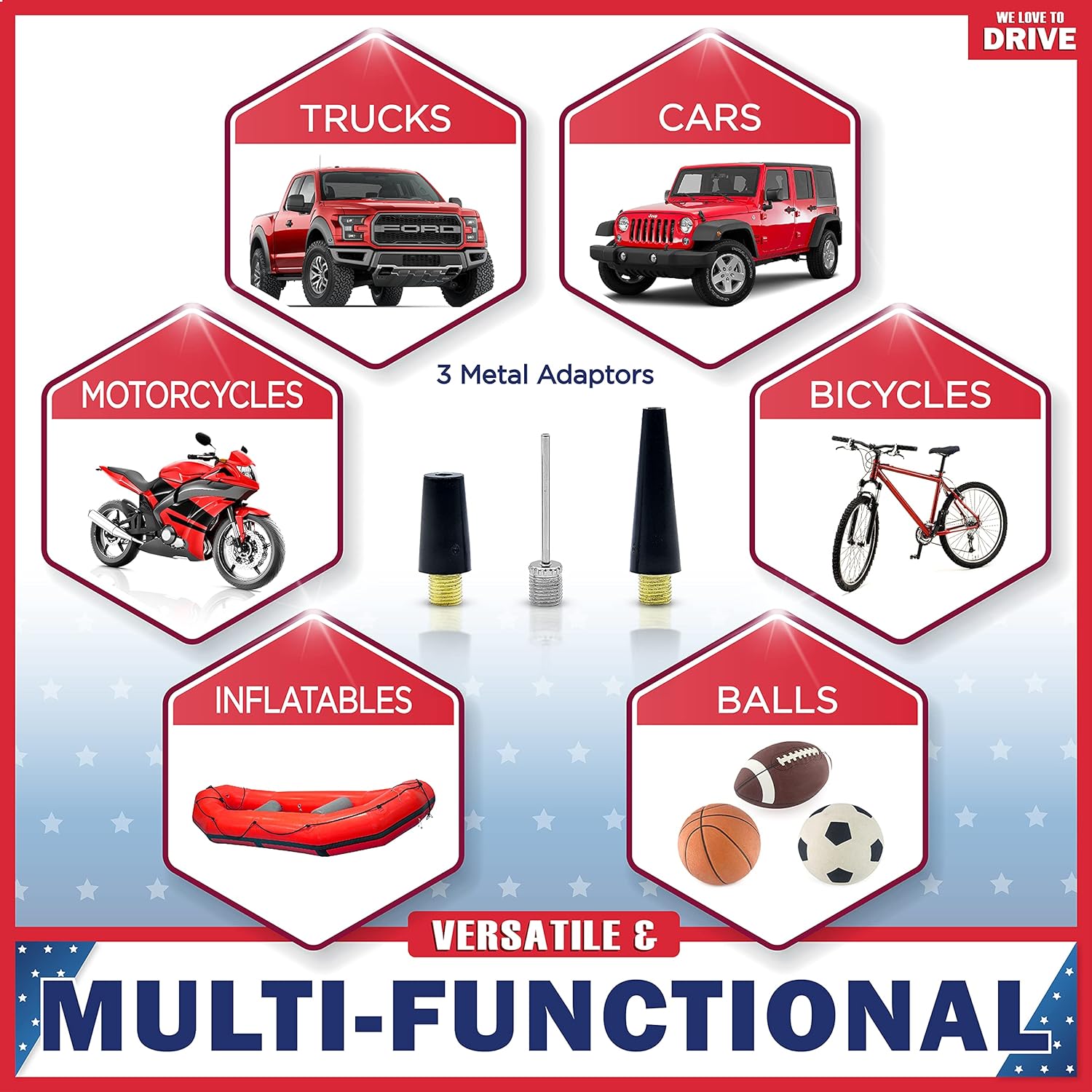 - Adaptable Air – Use your 12V air compressor kit to inflate a variety of tires and sporting equipment. Compress air up to 150 PSI and channel it through your choice of 3 different threaded adaptors. Reaches front and back tires of all cars, trucks, and SUVs. With the 3 inflation tips included, the compressor will also inflate bikes, motorcycles, balls, air mattresses, sports equipment, and other inflatables.