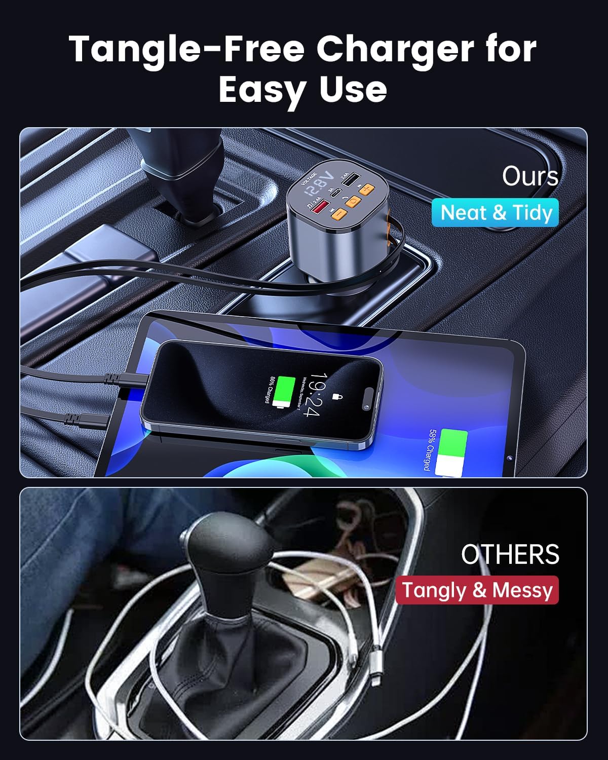- 🔌【Retractable PD USB-C & Lightning Cables】Includes 31.5-inch (80cm) retractable Type-C and Lightning cables, keeping your car neat while easily charging Apple and Android devices.