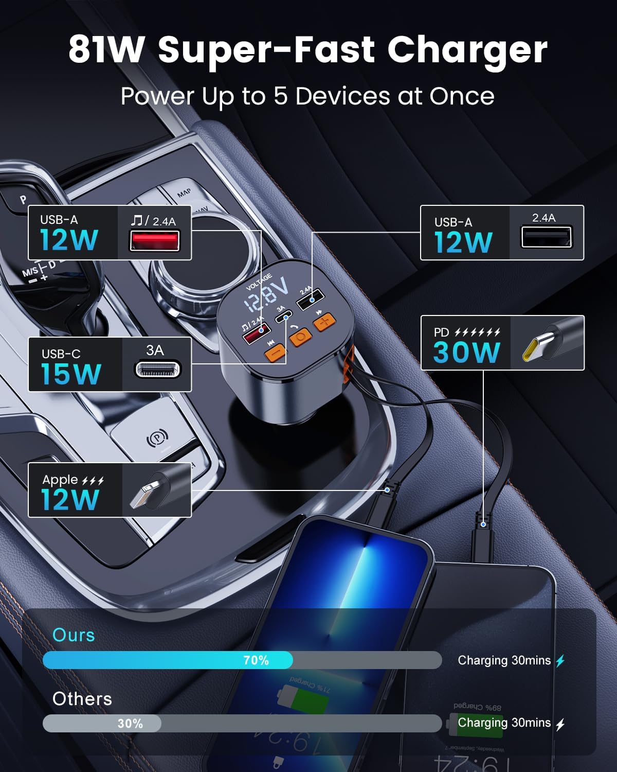 - ⚡【81W 5-Port Super Fast Charging】Charge up to 5 devices simultaneously with 81W of power, featuring a PD 30W USB-C port, a 12W Lightning retractable cable, a 15W USB-C port, and two 12W USB-A ports—catering to all your charging needs and keeping your phone powered and ready whenever you need it.