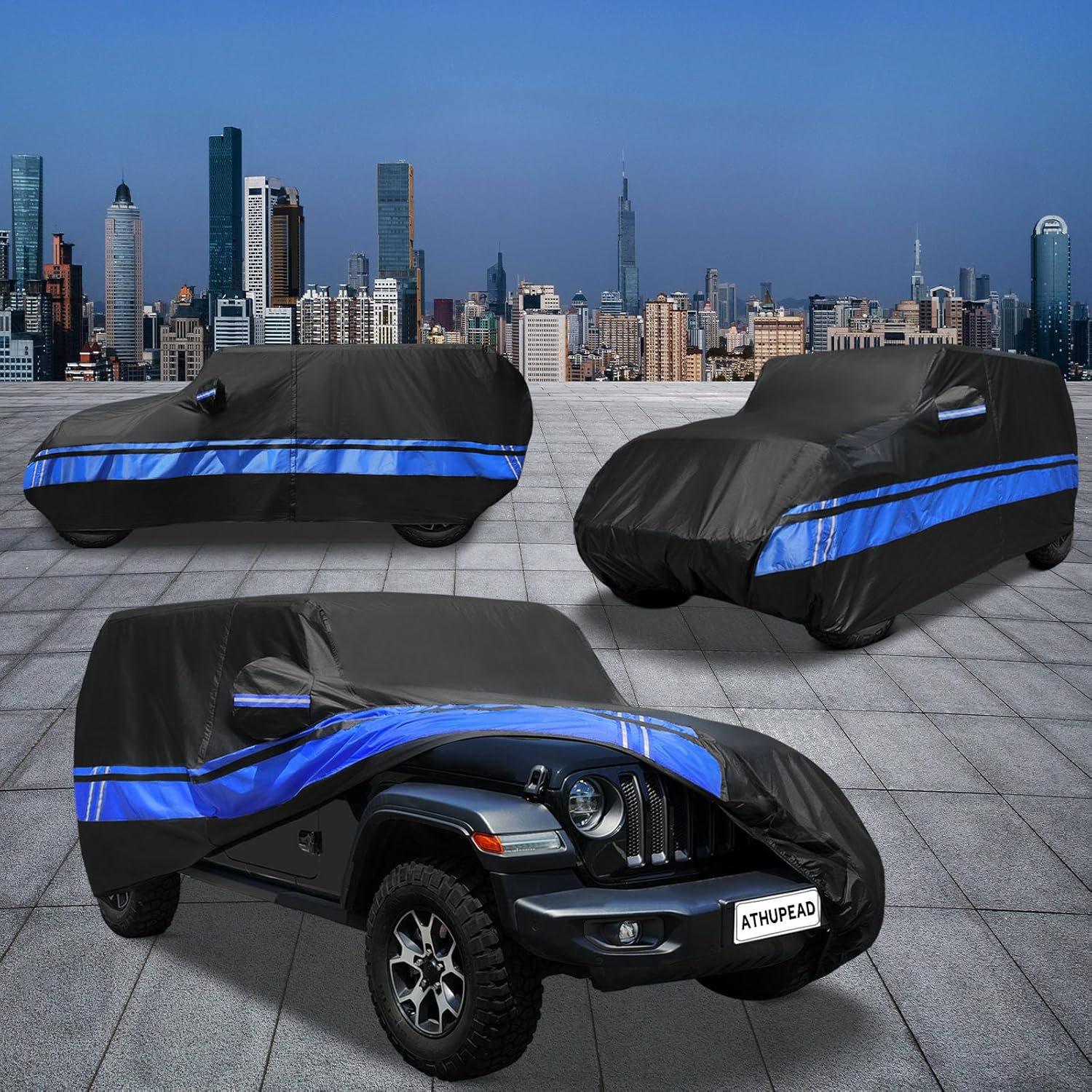- ăMultifunctional Designă1.ATHUPEAD Jeep Waterproof 4 door has a door zipper on the driver's side. 2. Unique reflective strip design to remind others at night. 3. There are vents on the side of the car cover. 4. There is a front logo on the front of the car cover. 5. The car cover provides an antenna eyelet kit.