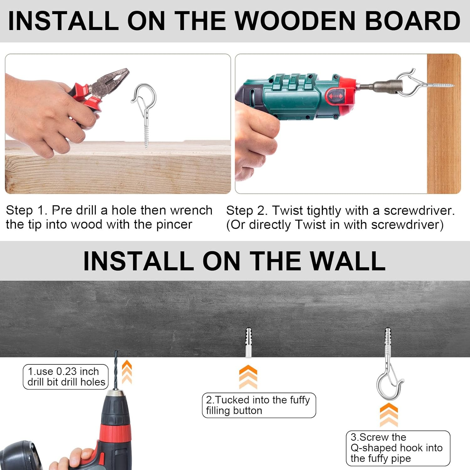 - Easy To Install - Come with plastic tubes, swivel hooks for hanging are easy to install all solid surface such as walls, ceiling, wooden beams, tree, fence, eaves etc. You can pre drill a hole then wrench the string light hooks outdoor directly in.