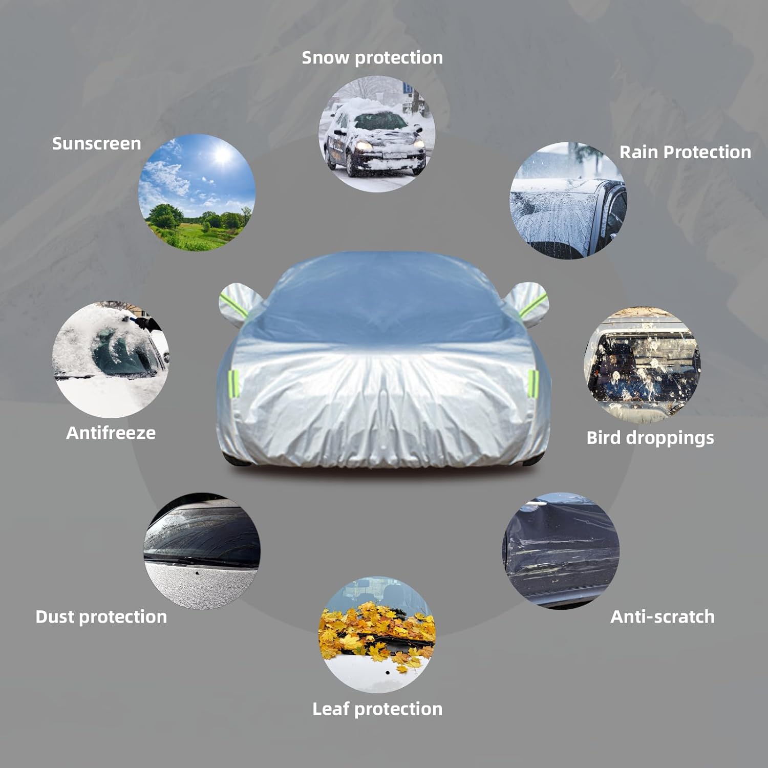 - ăAll-Season Protectionă Whether under the scorching sun or in frigid weather, our SUV car cover provides comprehensive protection across all four seasons. It guards against dust, snow, hail, industrial pollutants, bird droppings, leaves, pollen, acid rain, and intense sunlight, preserving your car's exterior in all conditions.