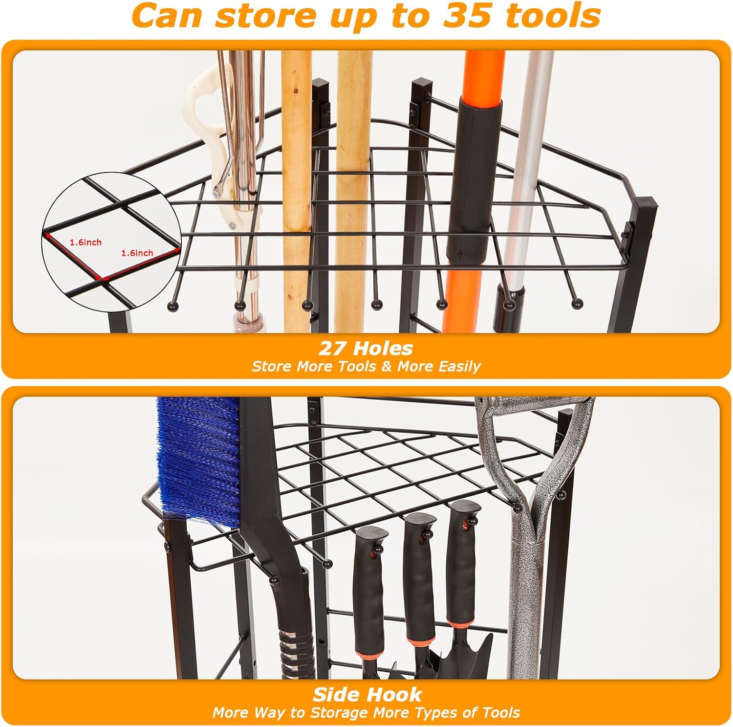 - Large Capacity: Our garden tool holder has both square holes and side hooks. 27 holes allows to hold a large number of long handled tools. 7 side hooks to hang the small lawn tools. Multiple kinds and sizes of tools can be well stored