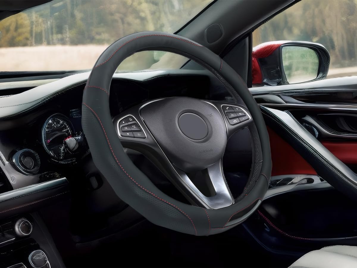 - Premium Materials: The carbon steering wheel cover is made of microfiber leather, add a comfort sponge to the side. It is firm, durable and comfortable to touch. Flexible and smooth stitching, not easy to fall off, meets your high requirements for driving