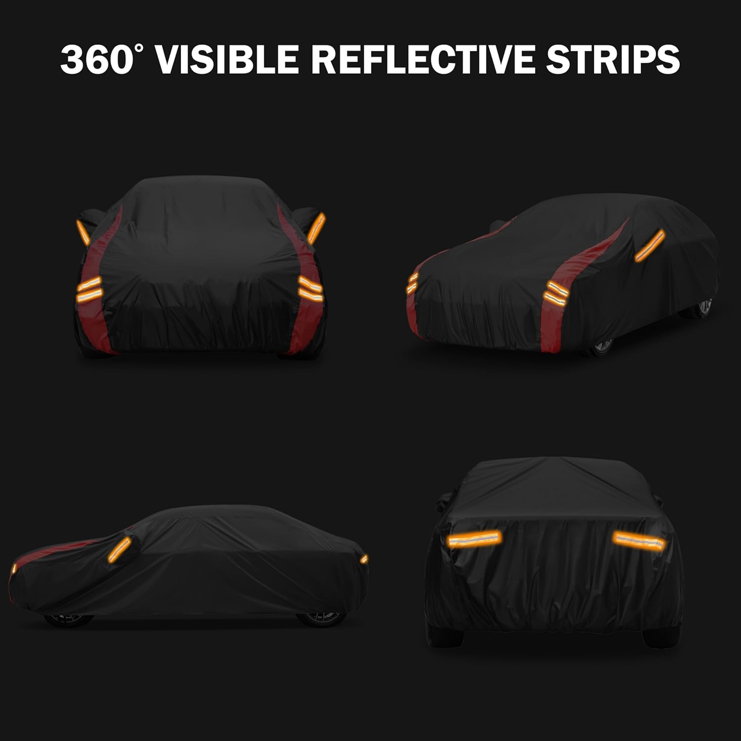 - ăUnique Designă â This all-weather waterproof car cover is specially designed to resist strong winds. Three specially designed windproof straps at the bottom pass through the middle of the vehicle to ensure that the cover stays in place. An additional windproof strap at the rear of the car prevents the rear cover from being lifted by the wind. âĄEquipped with 6 reflective strips, these full-coverage reflective strips serve as a nighttime reminder to others, ensuring parking safety. perfectly protect your side mirrors and prevent damage.