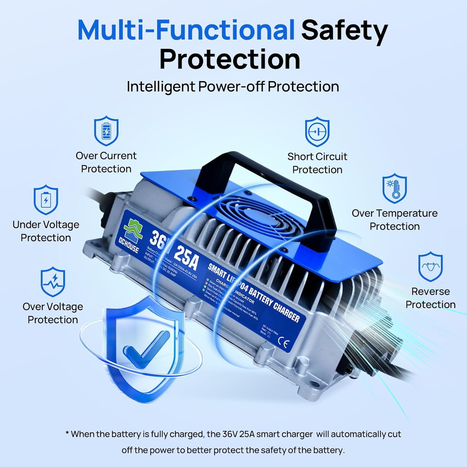 DC HOUSE 36V 25A Lithium Battery Charger, 900W Fast Charger, Charging Efficiency ≥ 93%, IP65 Waterproof Anti-Fall with Cooling Fan, Suitable for 36V Golf Cart,Trolling Motor, Forklift LiFePO4 Battery